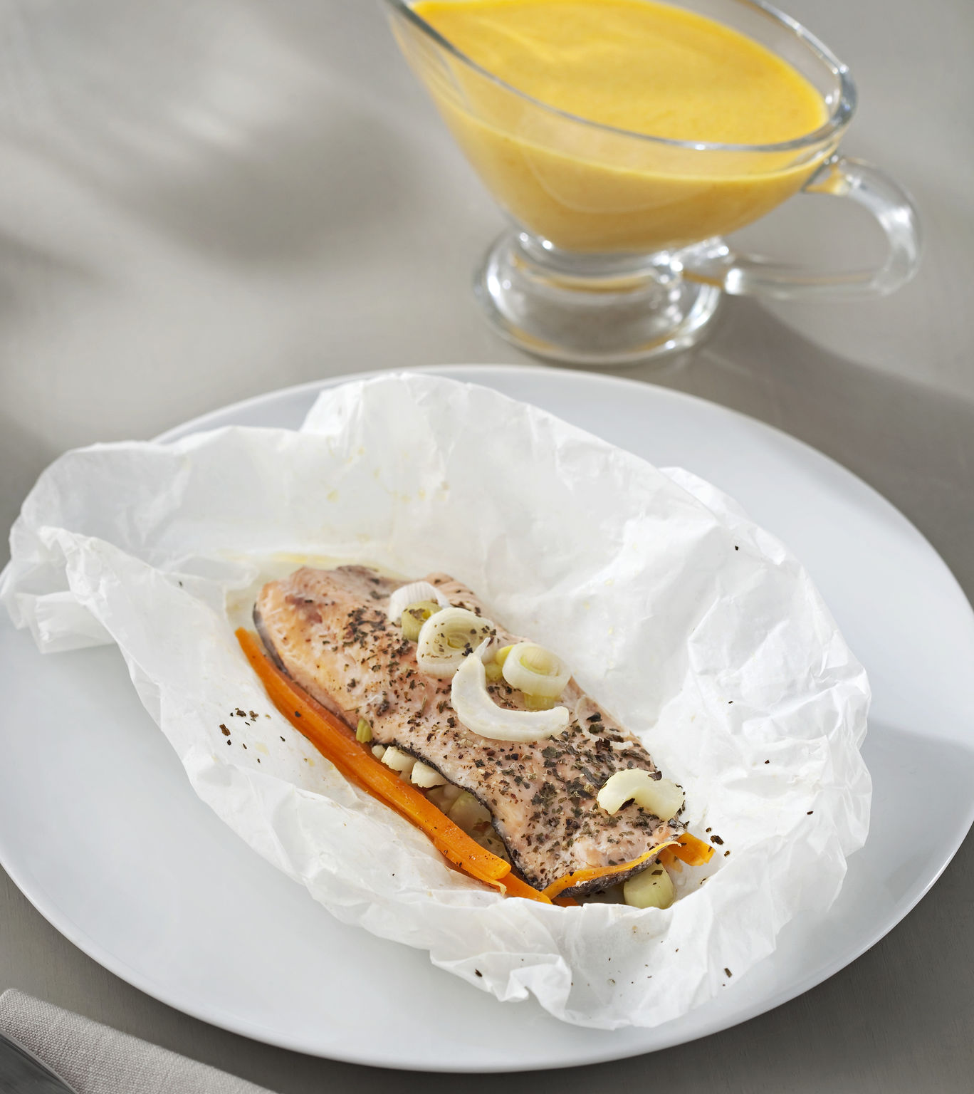Triture la salsa del vaso 20 seg/vel 8. Vierta en una salsera y sirva acompañando los papillotes.