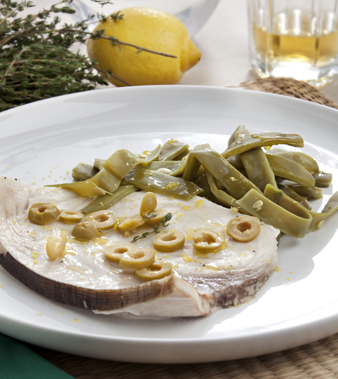 Sirva las judías verdes con el pescado, distribuya por encima las aceitunas, riegue con el aceite y añada la piel de limón rallada.