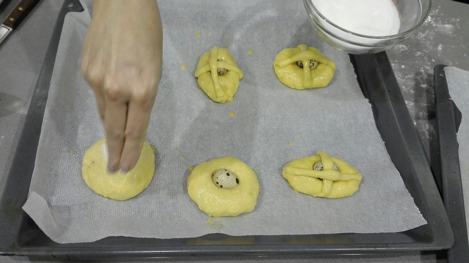 4) Con la masa forme una bola y luego divídala en 10 porciones. Haga con ellas diferentes formas (hay un montón de tutoriales en YouTube para hacer las formas más originales de tus monas) Colóquelas en la bandeja de horno preparada. Pintamos con huevo batido y espolvoreamos con azúcar. Dejar reposar hasta que doblen su volumen.
