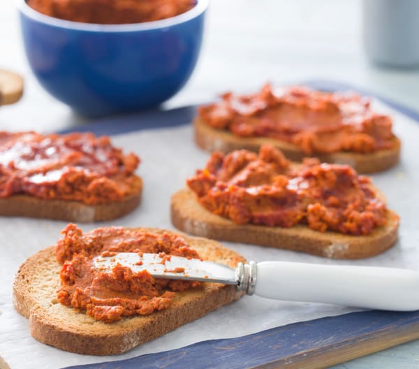 - Añade al vaso el ajo, el pimiento asado, el aceite, el pimentón, la sal y los tomates hidratados y escurrido y tritura 20 seg/vel 6. Unta las tostas con la sobrasada, coloca en una bandeja y sirve.