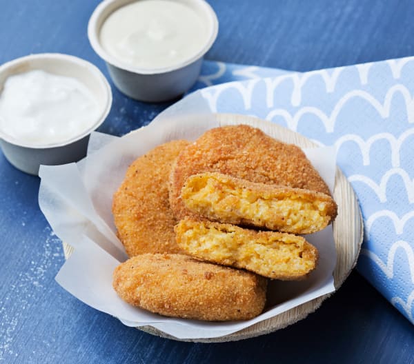 - Con la mezcla, forma bolas (de aprox. 30 g) y luego aplástalas para formar los nuggets. Pon a calentar el aceite en una sartén honda. Pasa los nuggets por la harina de garbanzos y colóqualos en una bandeja. Pon la leche de soja en un bol y en otro bol pon el pan rallado y el amaranto. Pasa los nuggets por la leche y luego por el pan rallado y fríelos en el aceite caliente. Escurre sobre papel de cocina y sirve con las salsas.