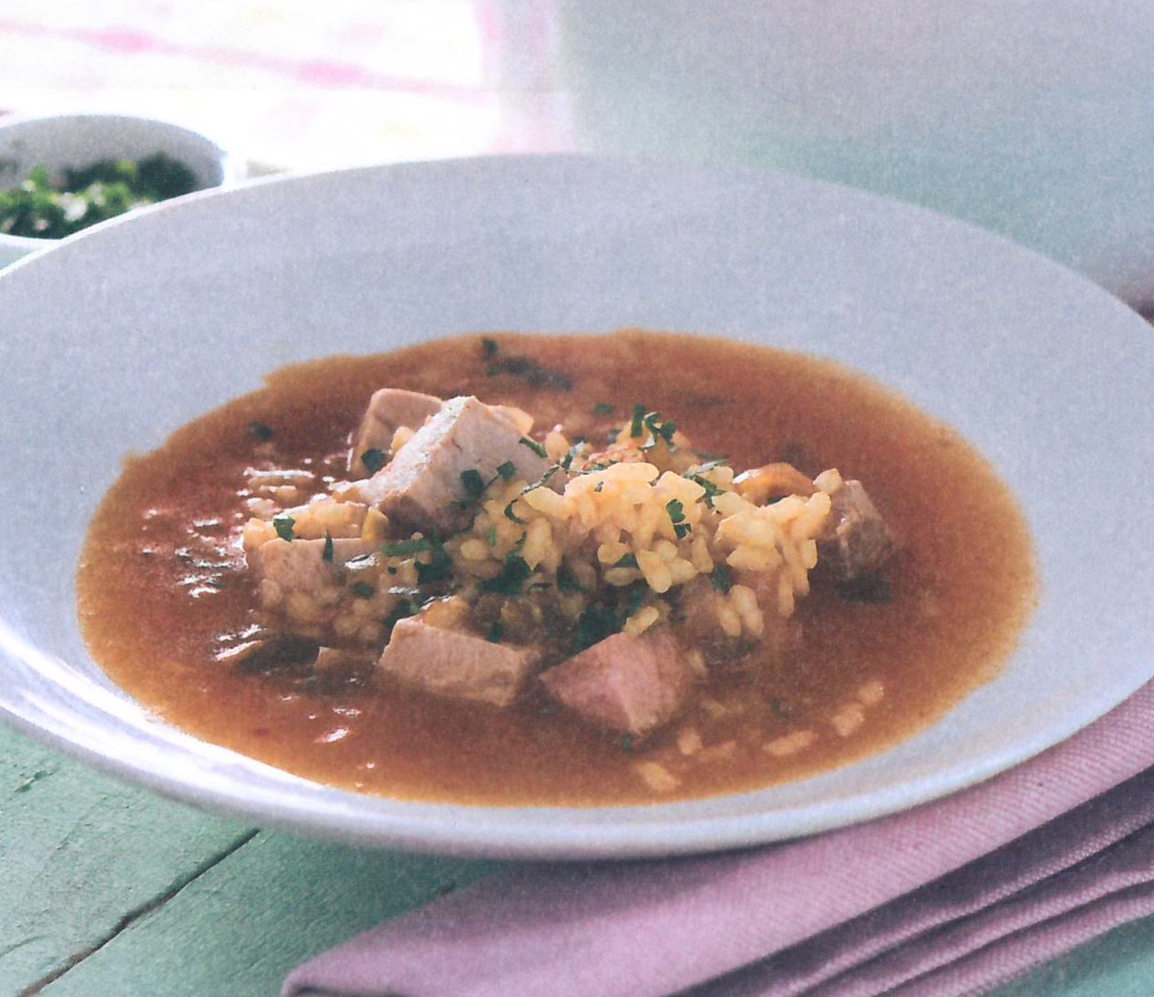 - Añade el atún y programa 3 minutos / 100 º/ giro inverso / vel cuchara. Vierte el arroz en una sopera y déjalo reposar de 3 a 5 minutos. Sirve espolvoreado con perejil picado.