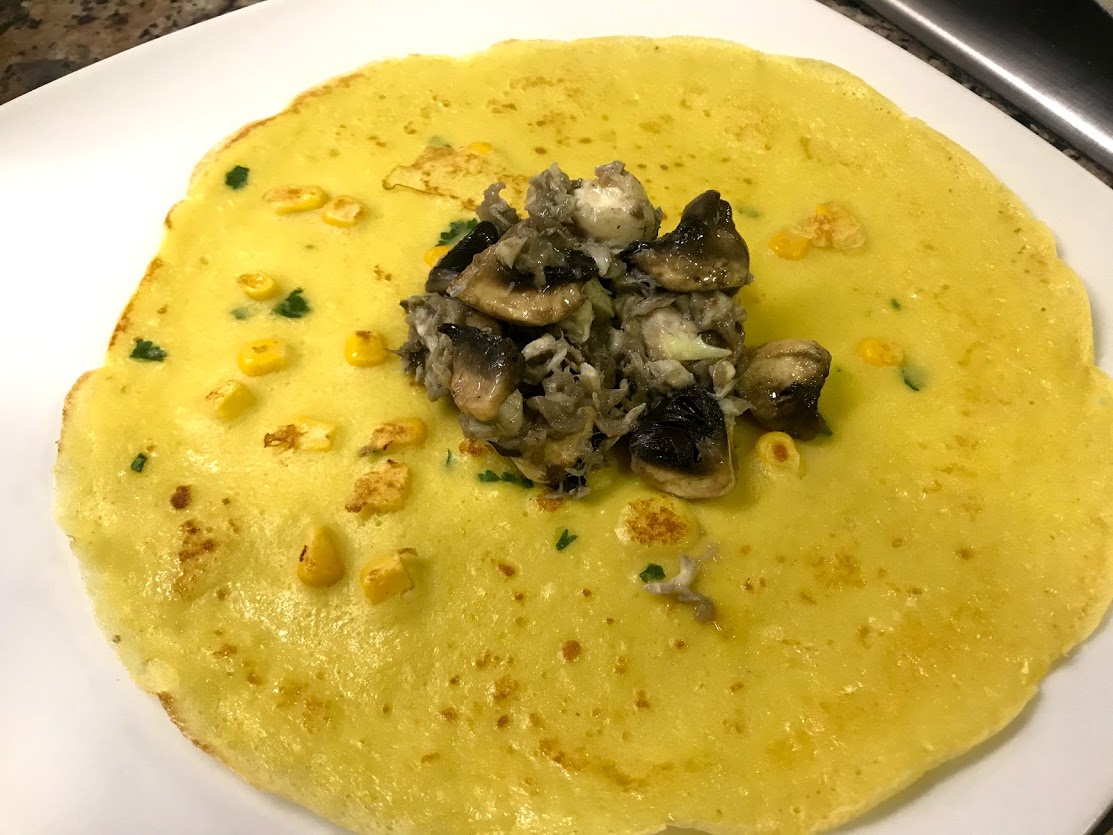 Crêpes de maíz dulce rellenas de pescado con champiñones