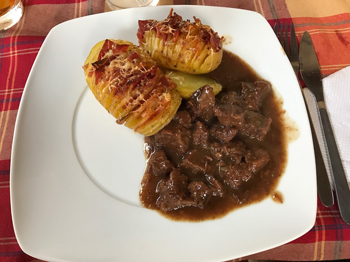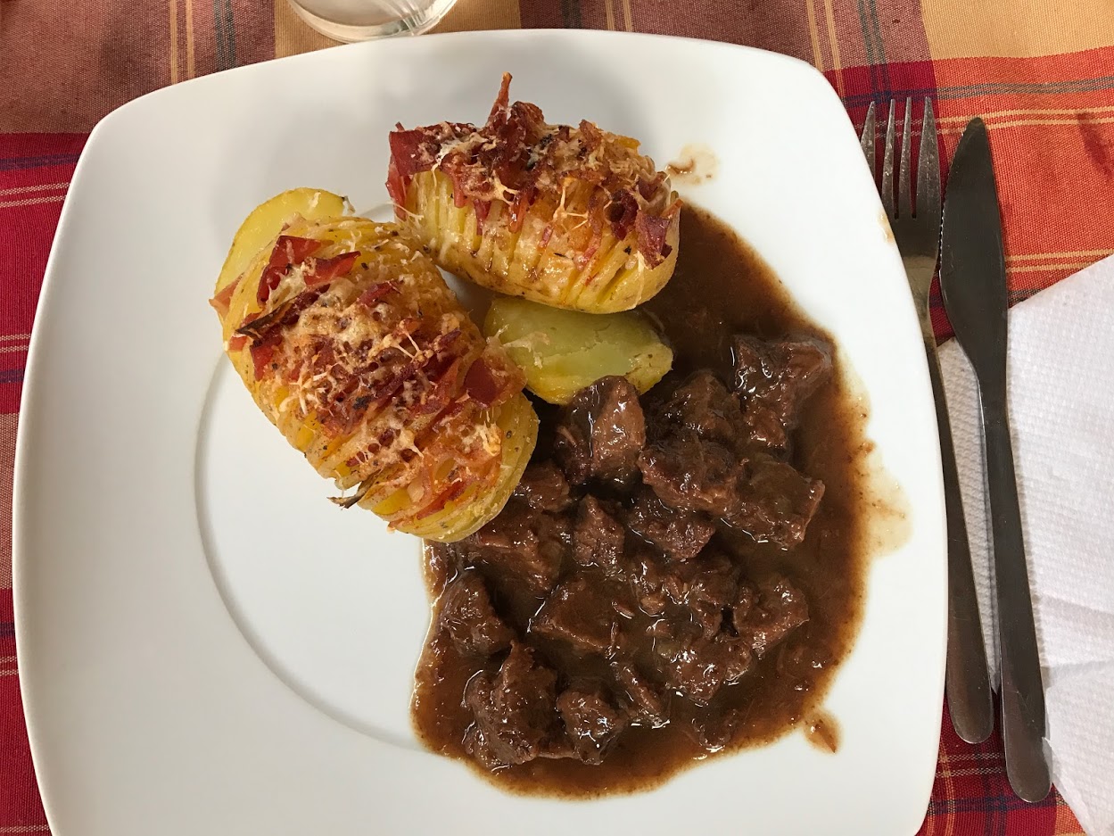 Carrilleras de ternera con arándanos y Patatas nuevas Hasselback