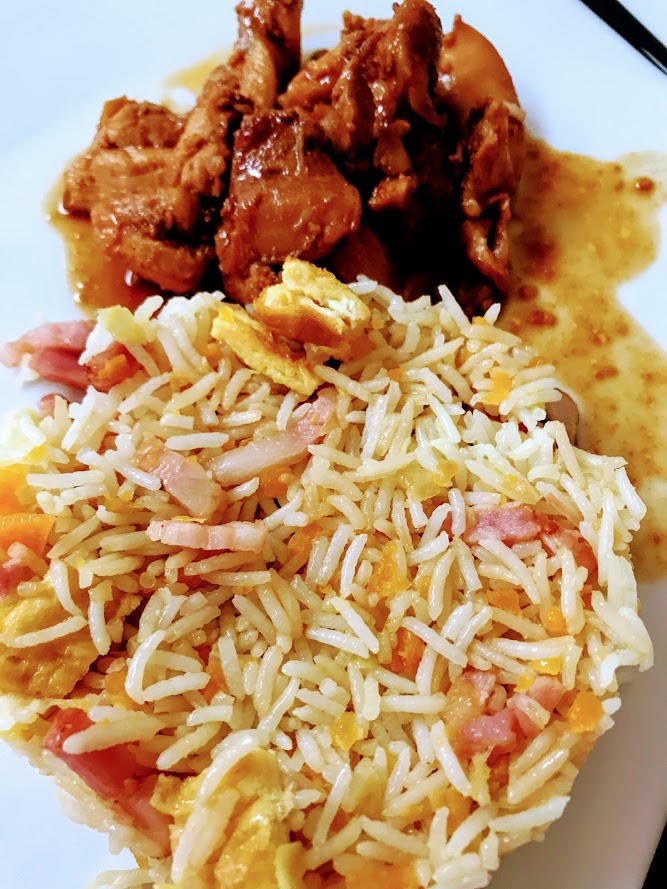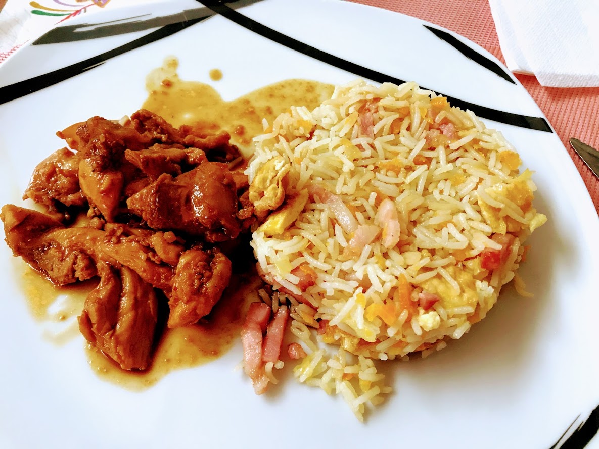 Retire el cestillo y vierta el arroz sobre los ingredientes reservados. Añada el beicon troceado, mezcle suavemente con la espátula y sirva caliente.