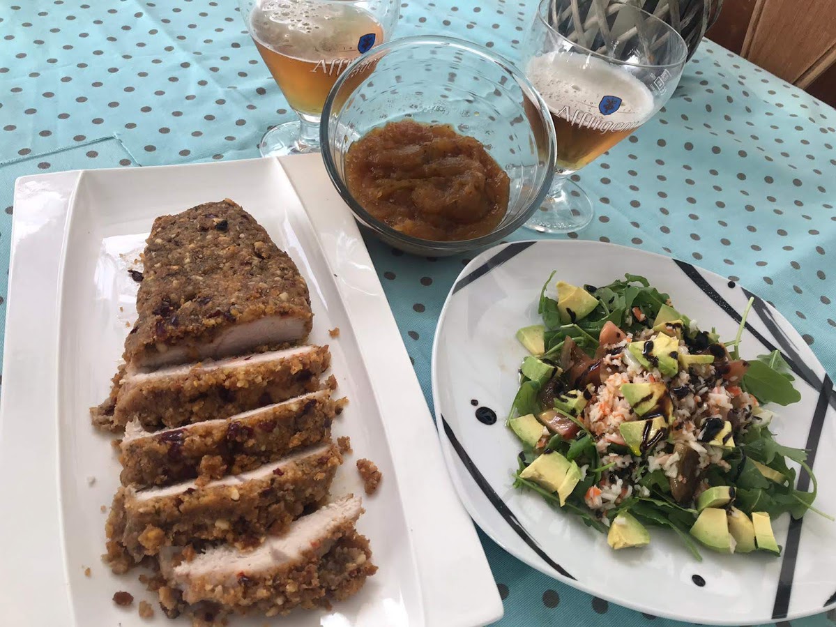 Pechuga se pavo con costra de frutos secos y puré de manzana