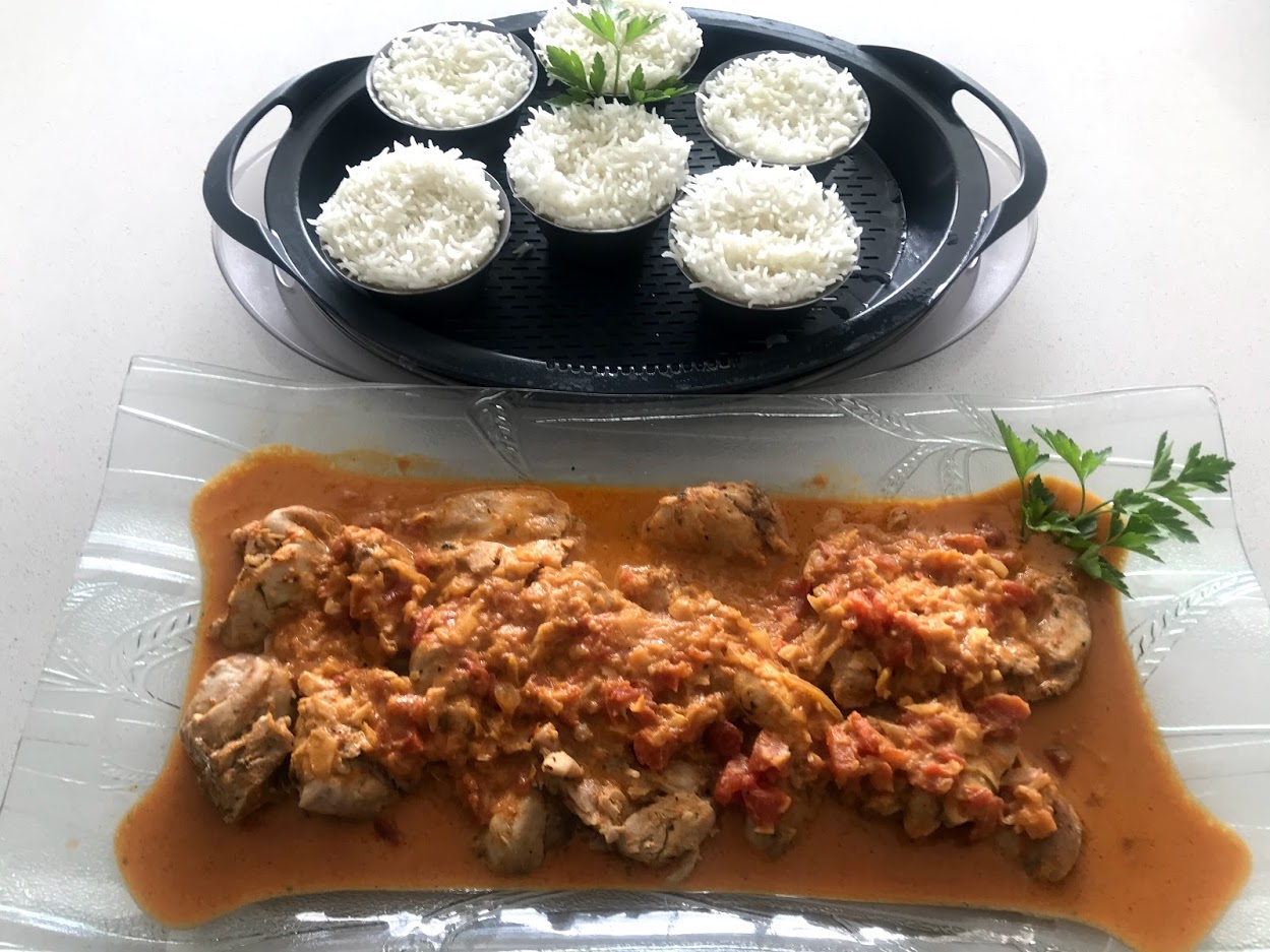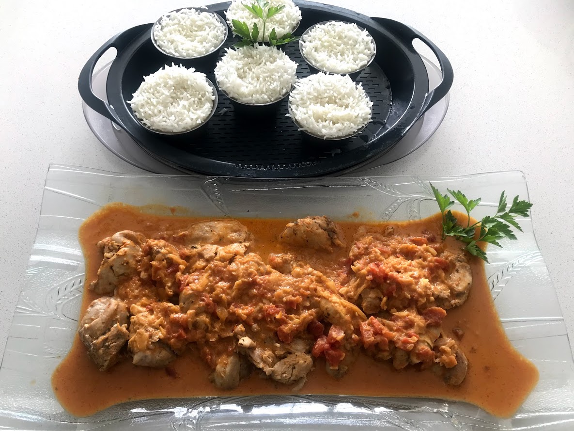 Incorpore el tomate troceado, la canela, el garam masala, 2 cucharaditas de pimentón dulce y 1 cucharadita de pimentón picante, 20 g de zumo de limón, la nata y el azúcar. Escurra en el recipiente Varoma el pollo y deseche el líquido. Sitúe el recipiente Varoma en su posición, tape y programe 15 min/Varoma/vel 1. Retire el Varoma y ponga el pollo en una fuente. Vierta la salsa del vaso sobre el pollo, mezcle bien con la espátula y sirva inmediatamente.
