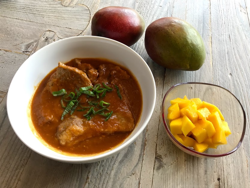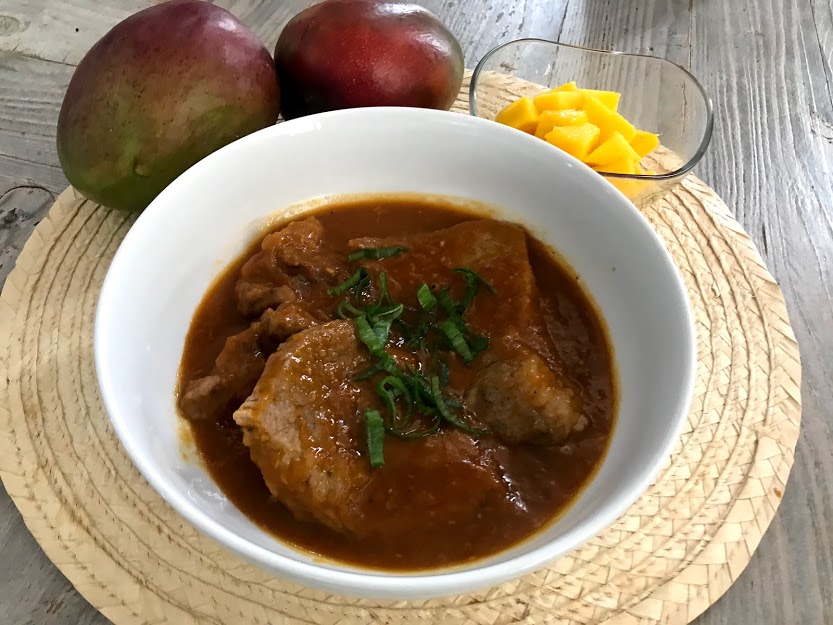 Añada al vaso los filetes de presa de cerdo dorados, coloque el cestillo sobre la tapa en lugar del cubilete y programe 10 min/Varoma/giro inverso/vel cuchara. Vierta en una fuente, espolvoree con el cebollino picado y sirva inmediatamente con los dados de mango restantes.