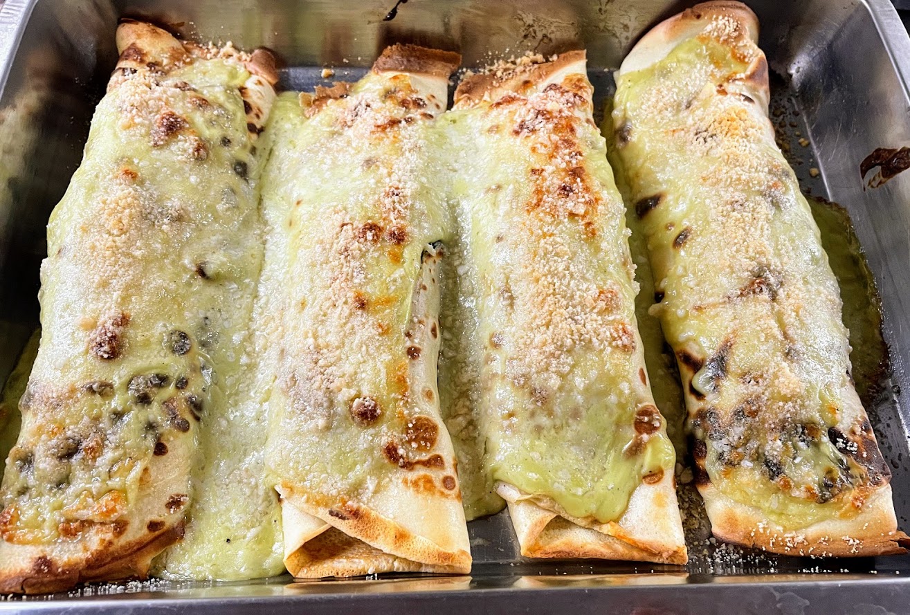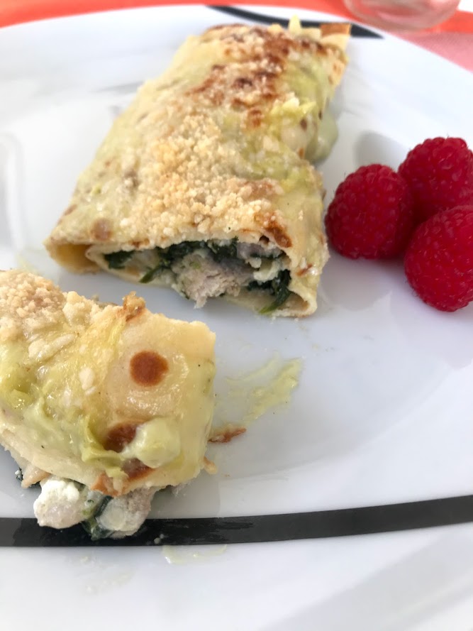 Crêpes rellenas de pollo, espinacas y queso de cabra con salsa de puerros