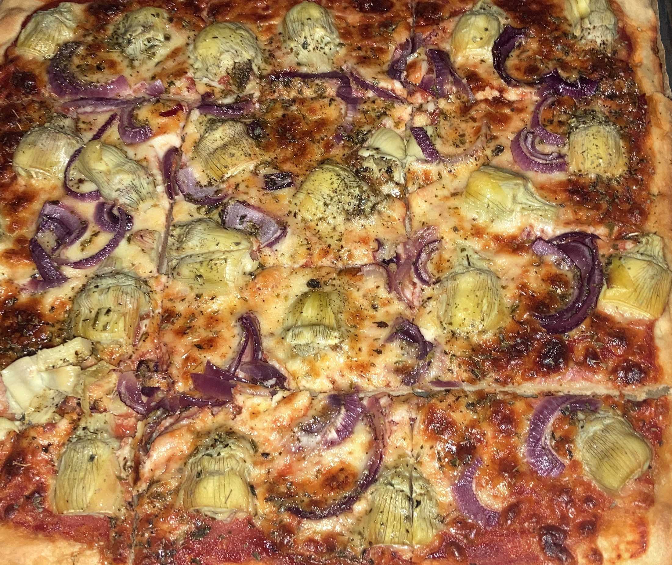 Distribuya el tomate sobre la masa y ponga encima la mozzarella, las alcachofas y la cebolla. Espolvoree con orégano y riegue con aceite de oliva.