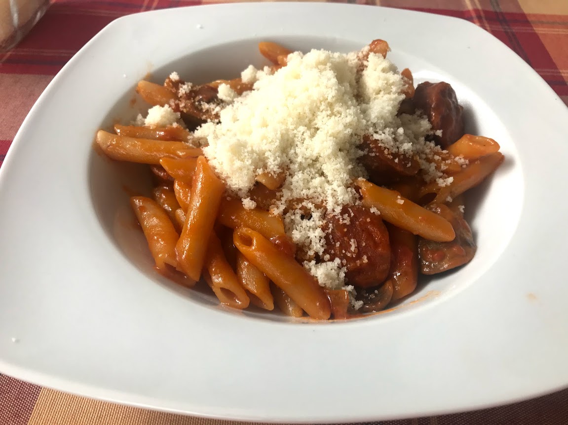 Ponga en el vaso el aceite, la pastilla de caldo, el ajo, el orégano, el chorizo, los champiñones, el tomate frito y el agua y programe 7 min/100°C/giro inverso/vel cuchara
