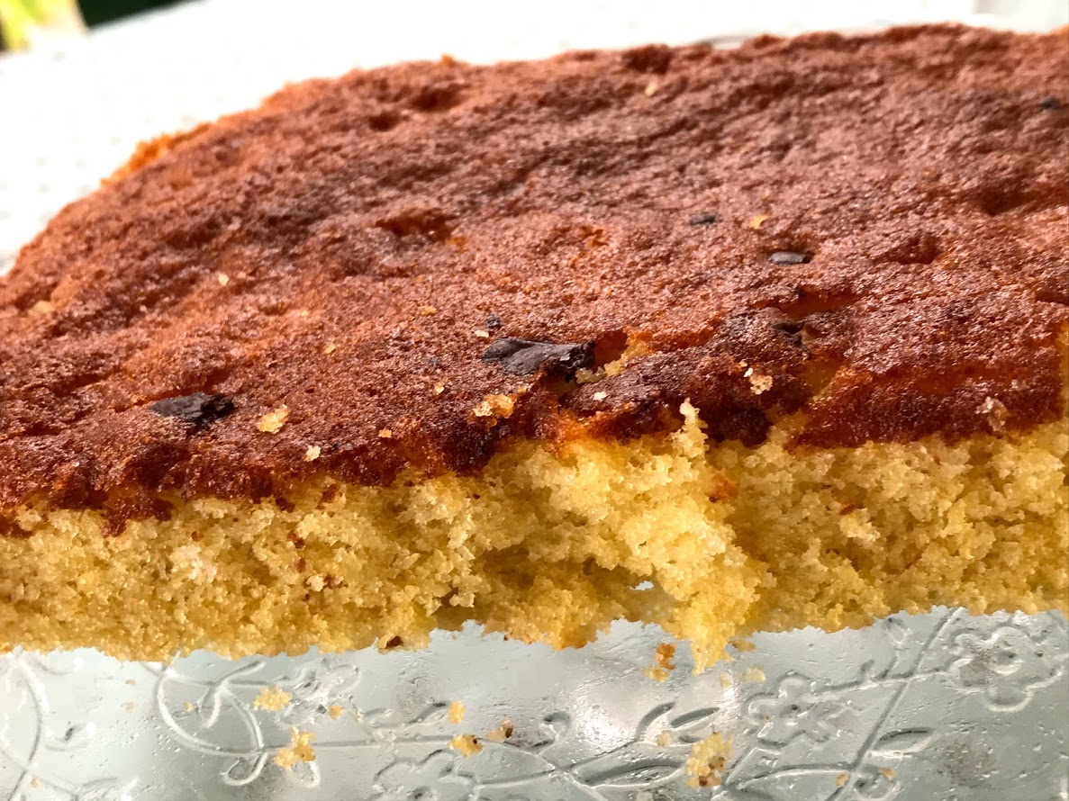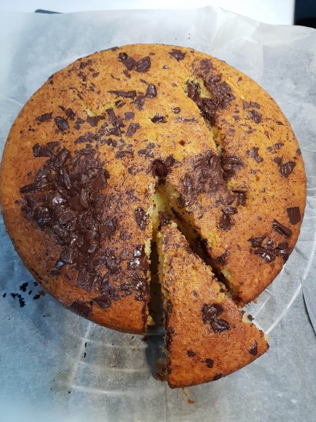 Vierta la mitad de la mezcla en el molde , colocamos las pepitas de chocolate, añadimos la mezcla que falta, e incorporamos la otra parte de chocolate (De esa manera no se bajan hacia el fondo).
