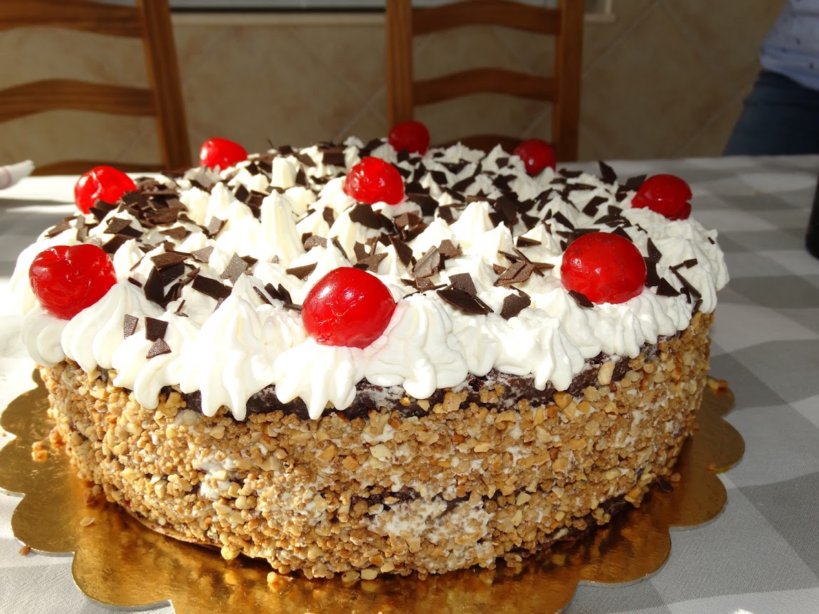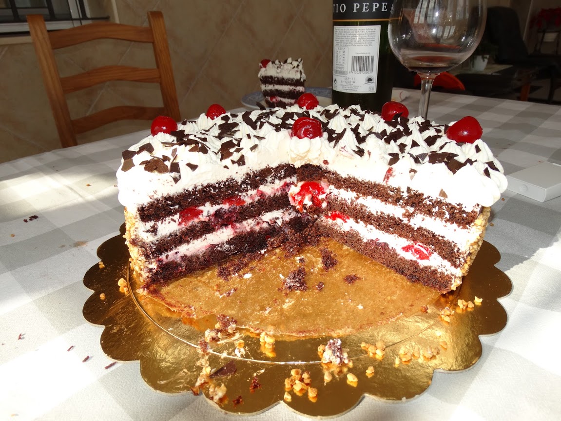 Riegue la primera capa del bizcocho con ⅓ de la mezcla de almíbar y kirsch. Cubra toda la superficie con ⅓ de nata montada y ponga encima la mitad de las cerezas. Repita este proceso terminando con la nata montada.