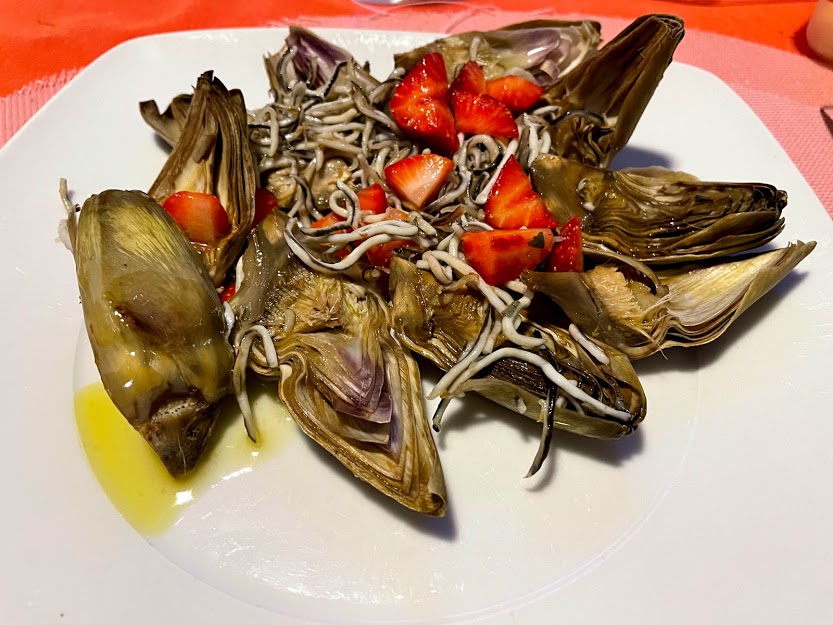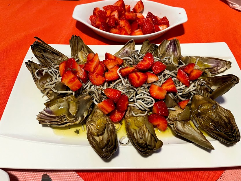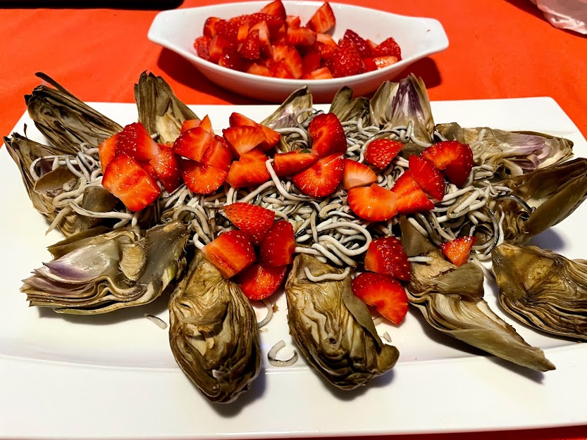 Alcachofas marinadas con gulas y fresas