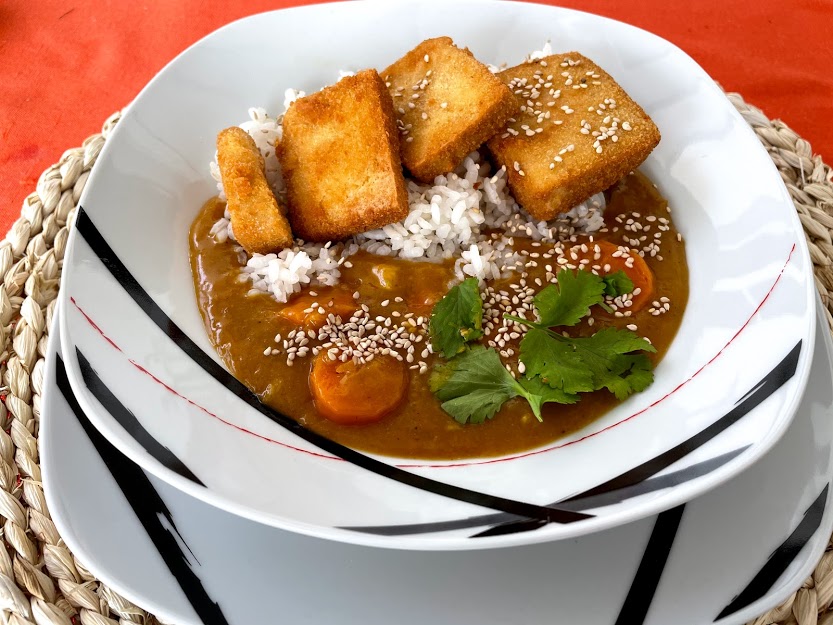 Agregue 200 g de salsa bechamel reservada, el curry en polvo, el garam masala, el ketchup, 90 g de agua, la salsa de soja, el azúcar moreno y 1 cucharadita de sal y cocine 20 min/100°C//vel 1. Mientras tanto, ponga a calentar en una sartén el aceite para freir. Retire el papel de cocina del tofu y córtelo en 4 rectángulos. Pase un trozo por la mezcla de harina reservada y reboce en el panko por todos los lados. Repita el proceso con los trozos restantes. Fría durante 2-3 minutos por cada lado o hasta que esté dorado y retire sobre papel de cocina. Vierta la salsa en un bol. Reparta el arroz blanco en 4 platos, coloque encima el tofu dorado en rebanadas y añada 2-3 cucharadas de salsa de curry. Decore con las hojas de cilantro, espolvoree con las semillas de sésamo y sirva.