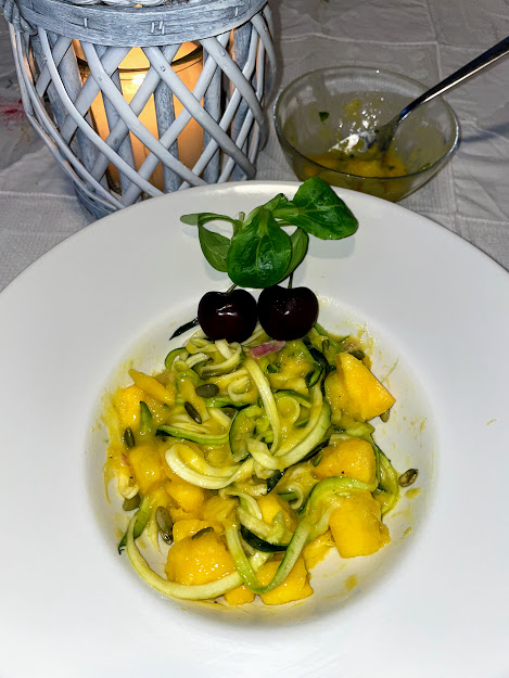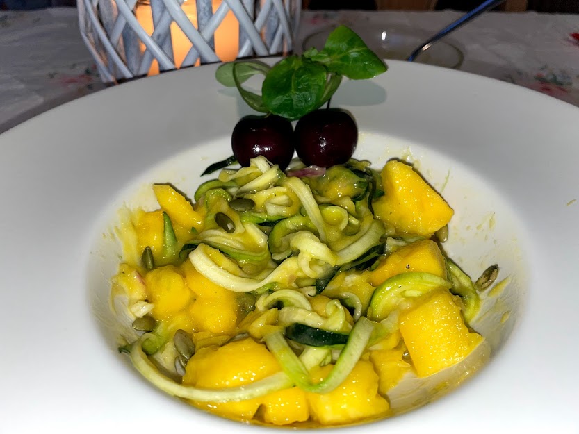 Ponga en una ensaladera los bastones de calabacín y de mango.