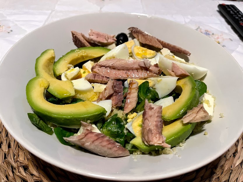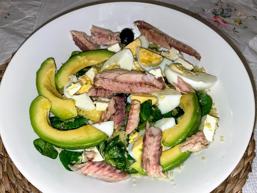 Cambie el pollo por caballa, la Quinoa por Cuscús y el pimiento por el aguacate.