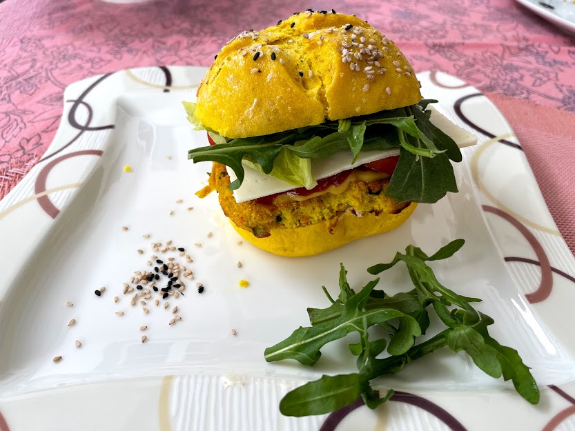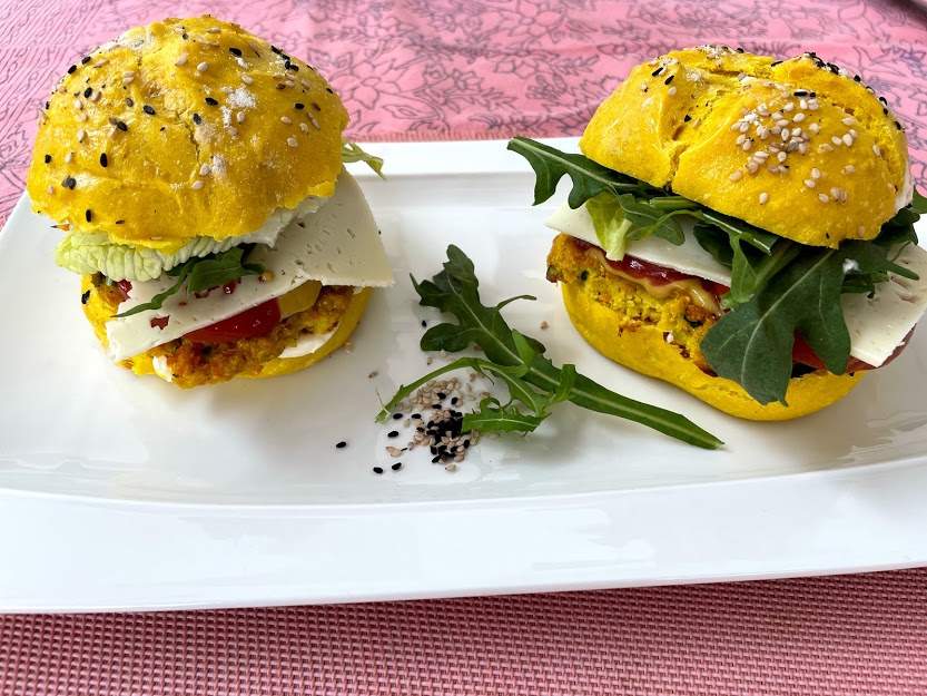 Hamburguesas de coliflor y calabaza con pan de cúrcuma