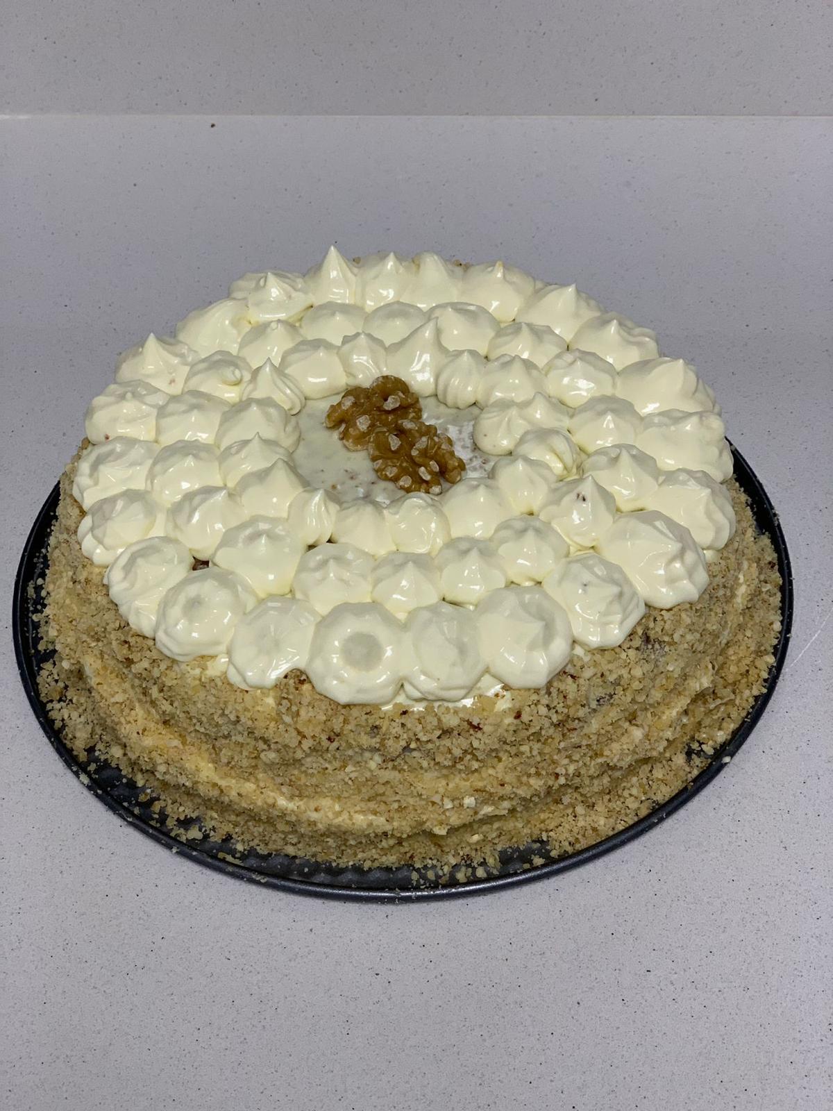 Corte el bizcocho por la mitad y rellene con la mitad del frosting. Cubra con la otra parte del bizcocho y extienda el resto del frosting sobre la superficie. Espolvoree con las nueces y deje enfriar 15 minutos en el frigorífico antes de servir.