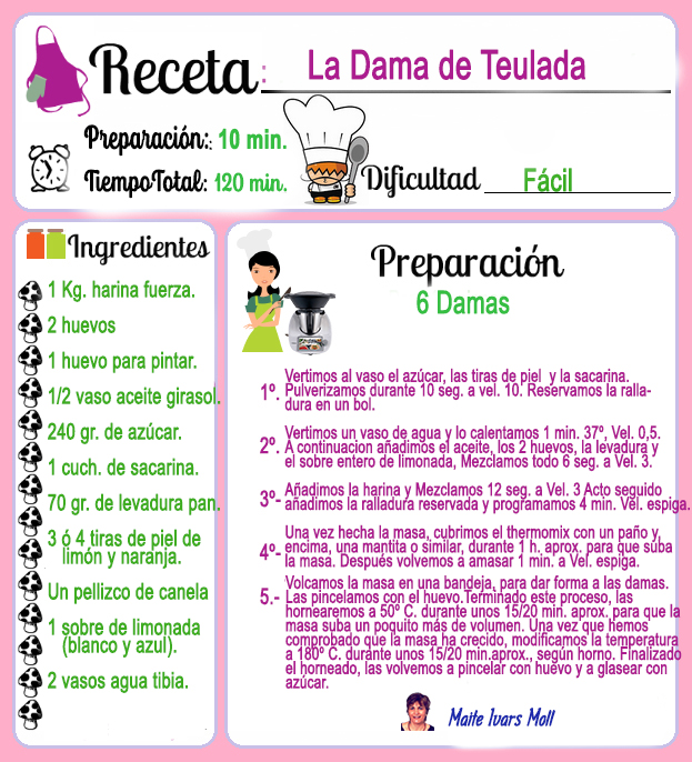 Aquí os pongo una receta muy antigua, típica exclusivamente de mi pueblo, Teulada. Se hacen el día 3 de Febrero, fiesta de San Blai. Este santo cura los males de garganta, por lo que los fieles seguidores lo llevan a la iglesia, para bendecir y luego comérsela. Es una receta parecida a las monas de Pascua. Están muy buenas. Así que, para San Blai, id preparando el thermomix para cocinar Las Damas. Esta receta nunca se ha hecho en vídeo y con thermomix. No existe en Cooki-doo.