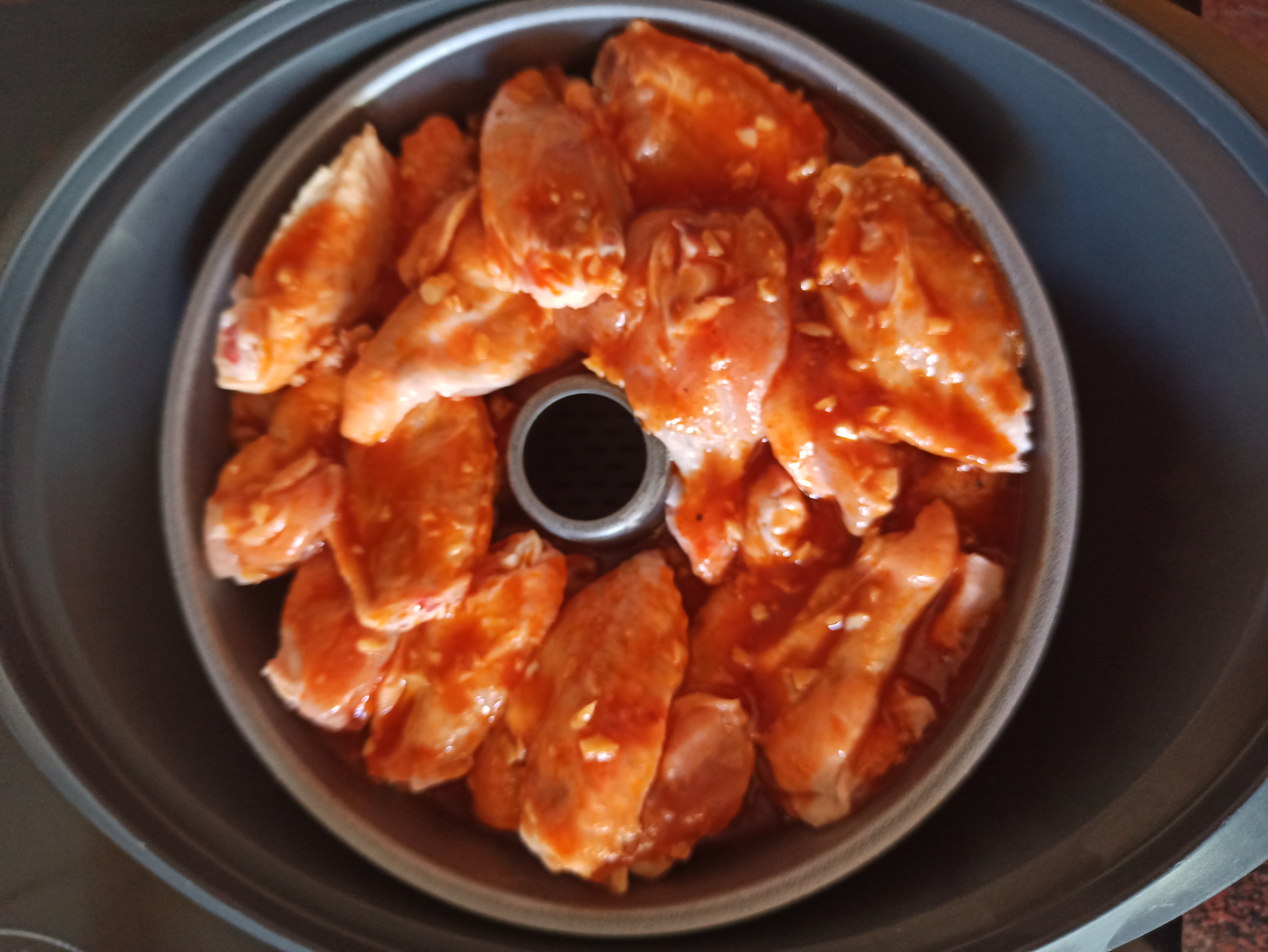 Ponemos la mezcla de alitas y salsa en una bolsa de asar, la cerramos y la colocamos en el recipiente Varoma. Tapamos y reservamos. Aclaramos el vaso.