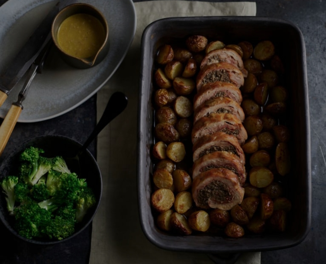 POLLO RELLENO SE CHAMPIÑONES CON PATATAS GLASEADAS