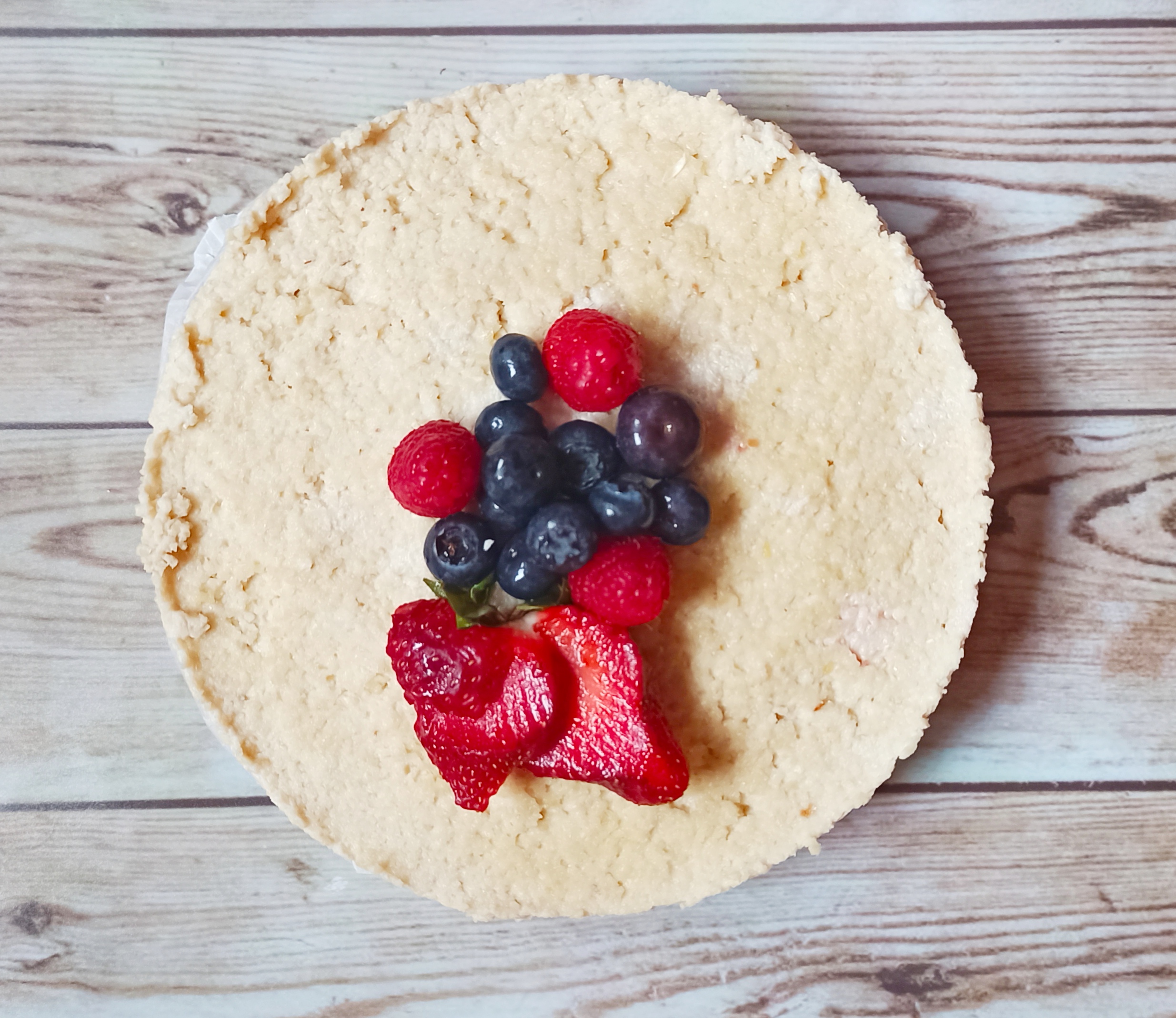 2. Añadimos el coco rallado y mezclamos 15 seg/vel 3. Retirar y extender en un molde redondo desmontable de 18 cm forrado con papel vegetal.