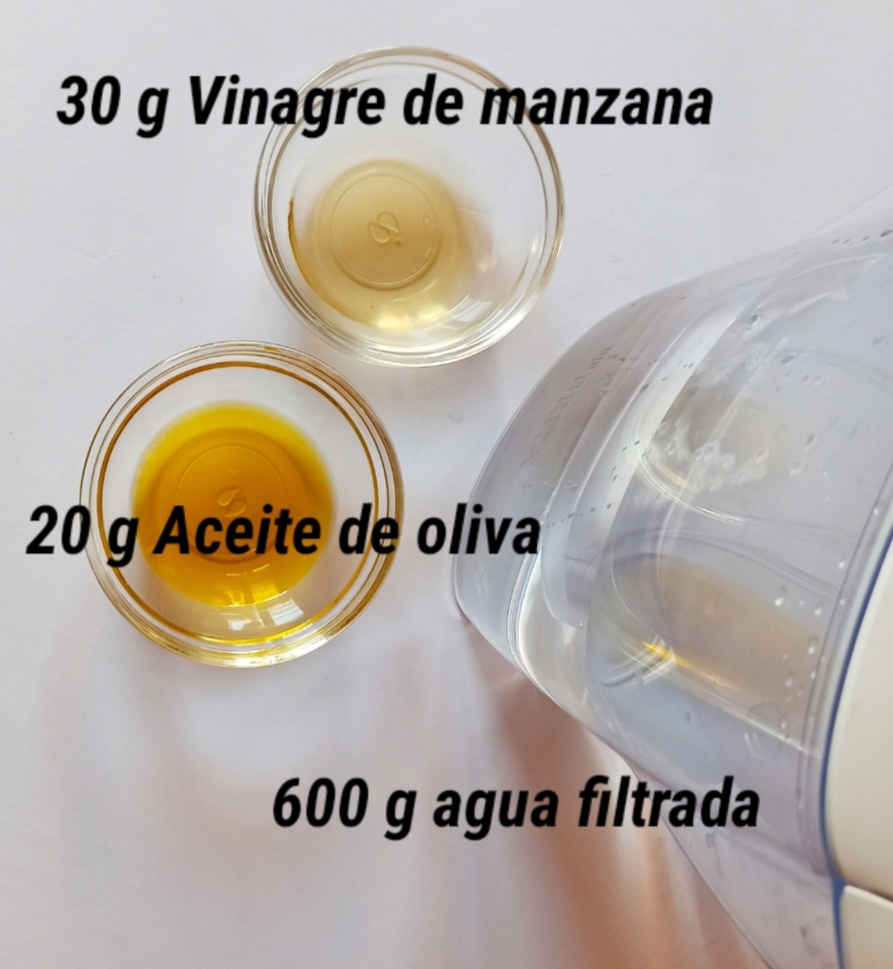 Estos son los ingredientes líquidos. Puedes sustituir el vinagre por zumo de limón.