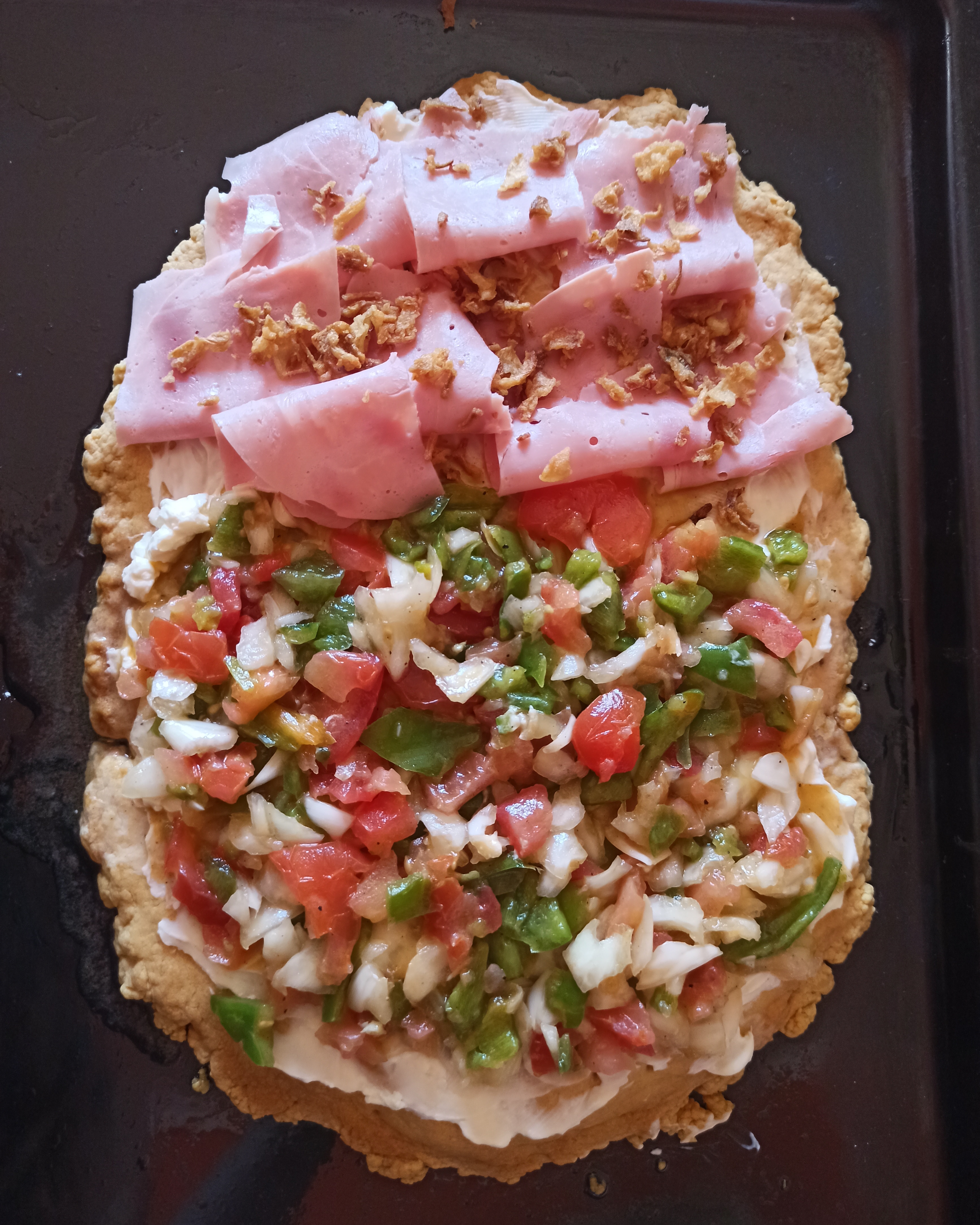 * Yo hice la mitad añadiendo jamón de York y cebolla frita .