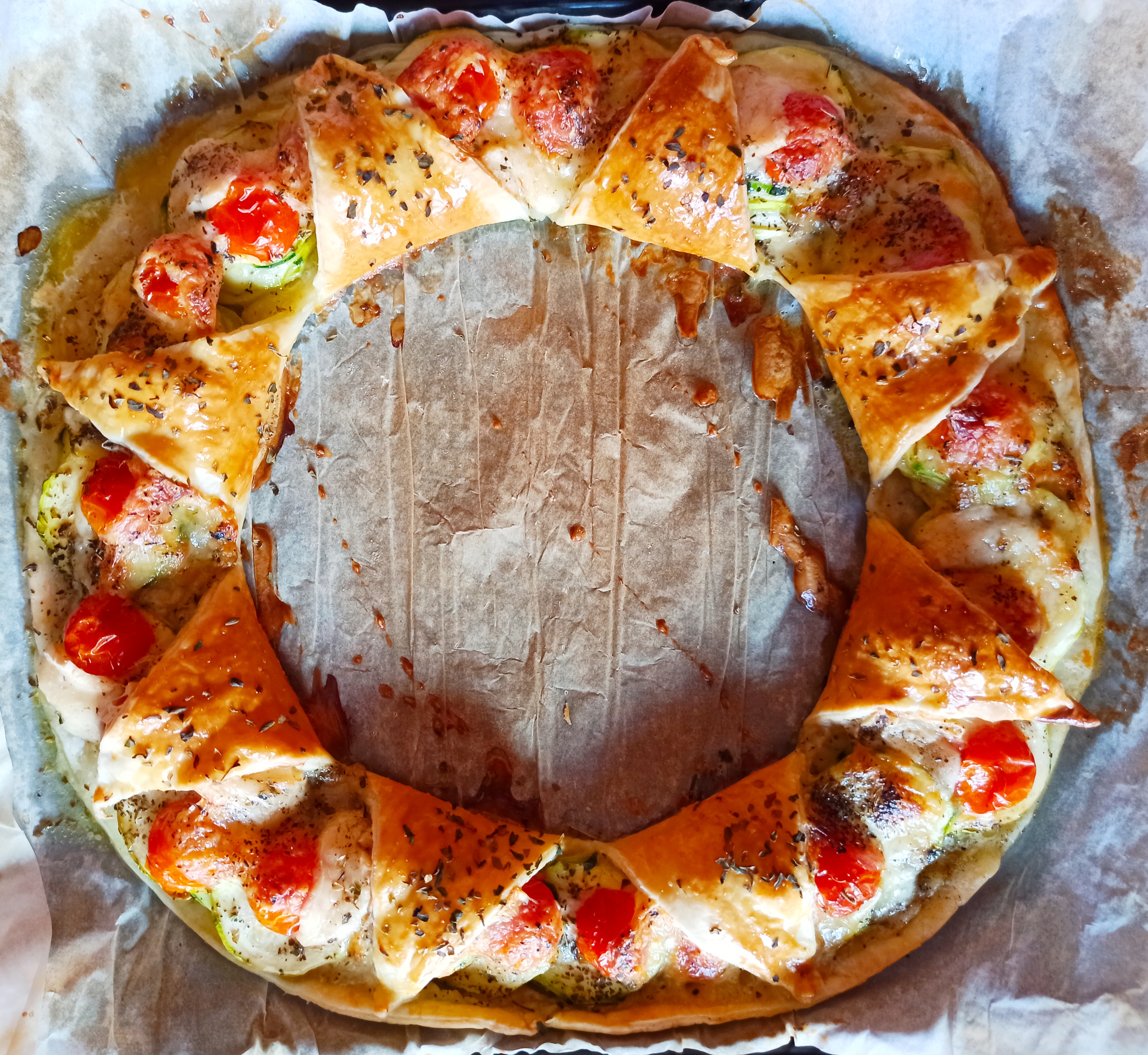 Desenvuelva la masa. Estire la masa con el rodillo y dele forma redonda(aprox. Ø 24 cm). Colóquela en la bandeja preparada y, empezando por el centro y hacia el borde, haga 8 cortes de aprox. 7 cm en forma de estrella (8 triángulos). Distribuya alrededor del borde de la masa el calabacín, los tomates cherry, la mozzarella, la albahaca y el queso feta. Riegue con un chorrito de aceite, espolvoree con 2-3 pellizcos de sal y 1 pellizco de pimienta molida y las hierbas provenzales. Desde el centro, superponga la masa sobre el relleno, pincele con huevo batido y espolvoree con el orégano.*