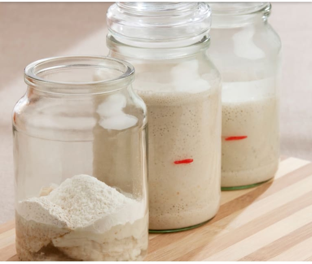 Conservación: En un recipiente (mejor de cristal) con tapa. Guarde el fermento natural de masa ácida en el frigorífico una vez preparado, así se paraliza la fermentación y queda como dormido. En la superficie se forma un líquido marrón con un agradable olor ácido a alcohol. Para activarlo, basta con alimentarlo con harina y agua y esperar que doble su volumen.