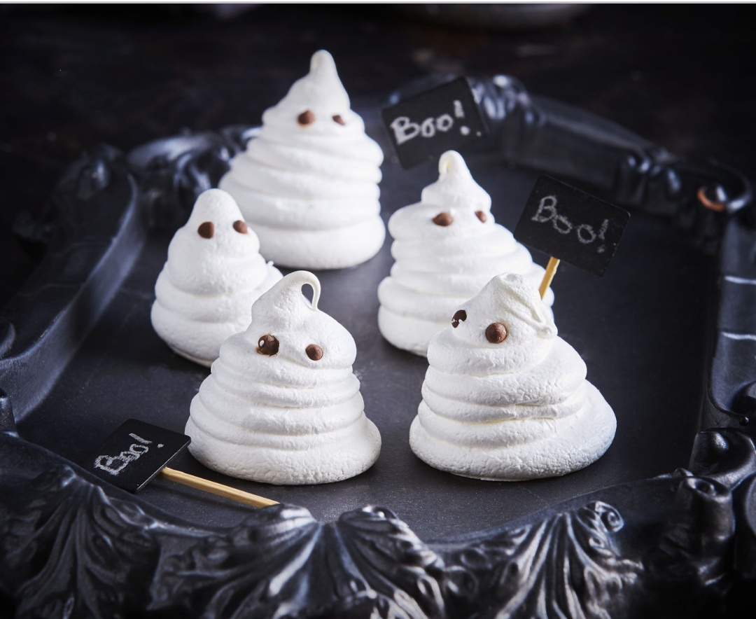- Forme los fantasmas sobre la bandeja de horno en espiral y añadir 2 pepitas de chocolate simulando los ojos.