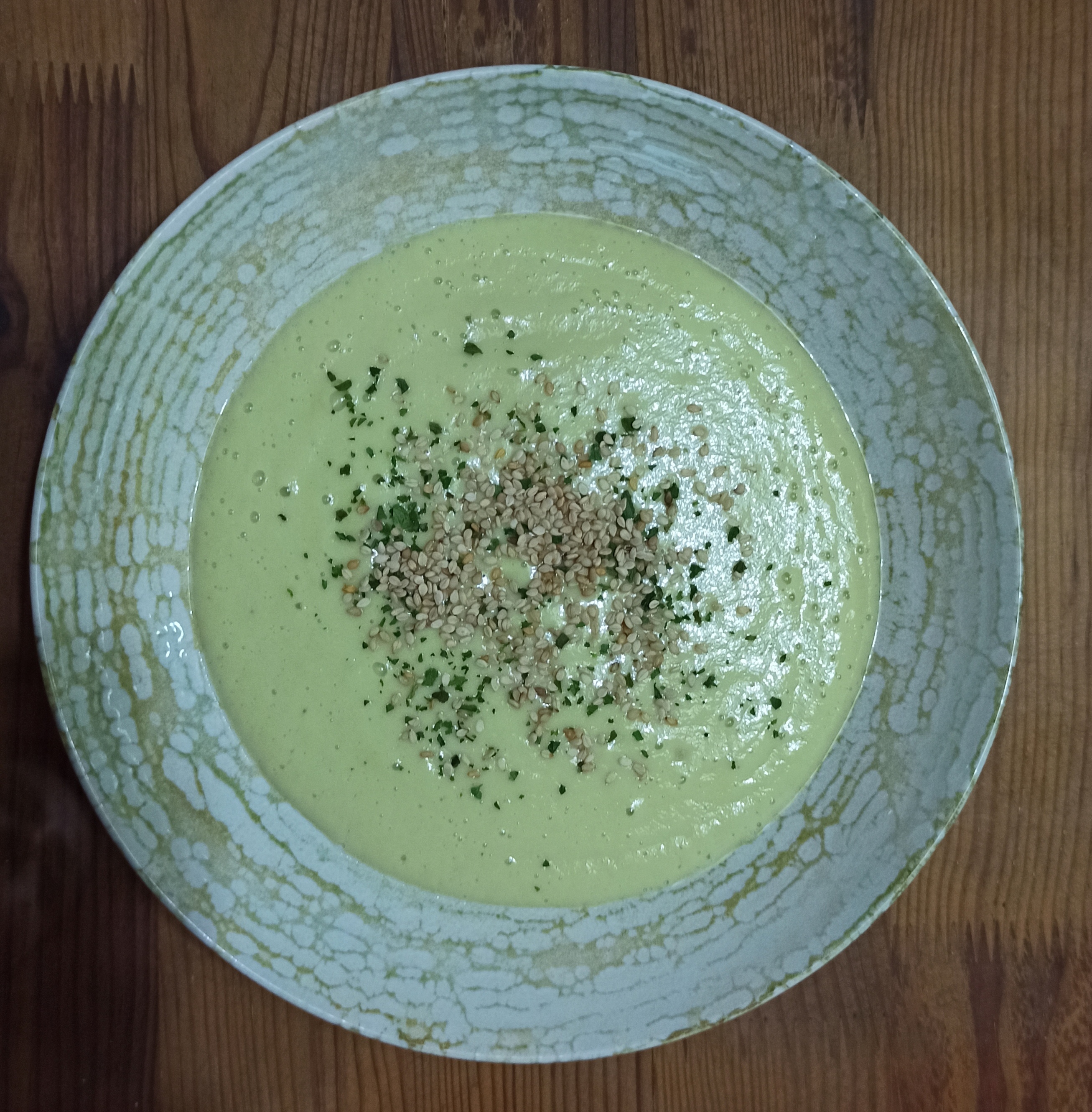 1. Ponemoa en el vaso todos los ingredientes y trituramos 1 min/vel 10. Servimos inmediatamente, decorado con el perejil picado y las semillas de sésamo tostado o reservamos en el frigorífico.