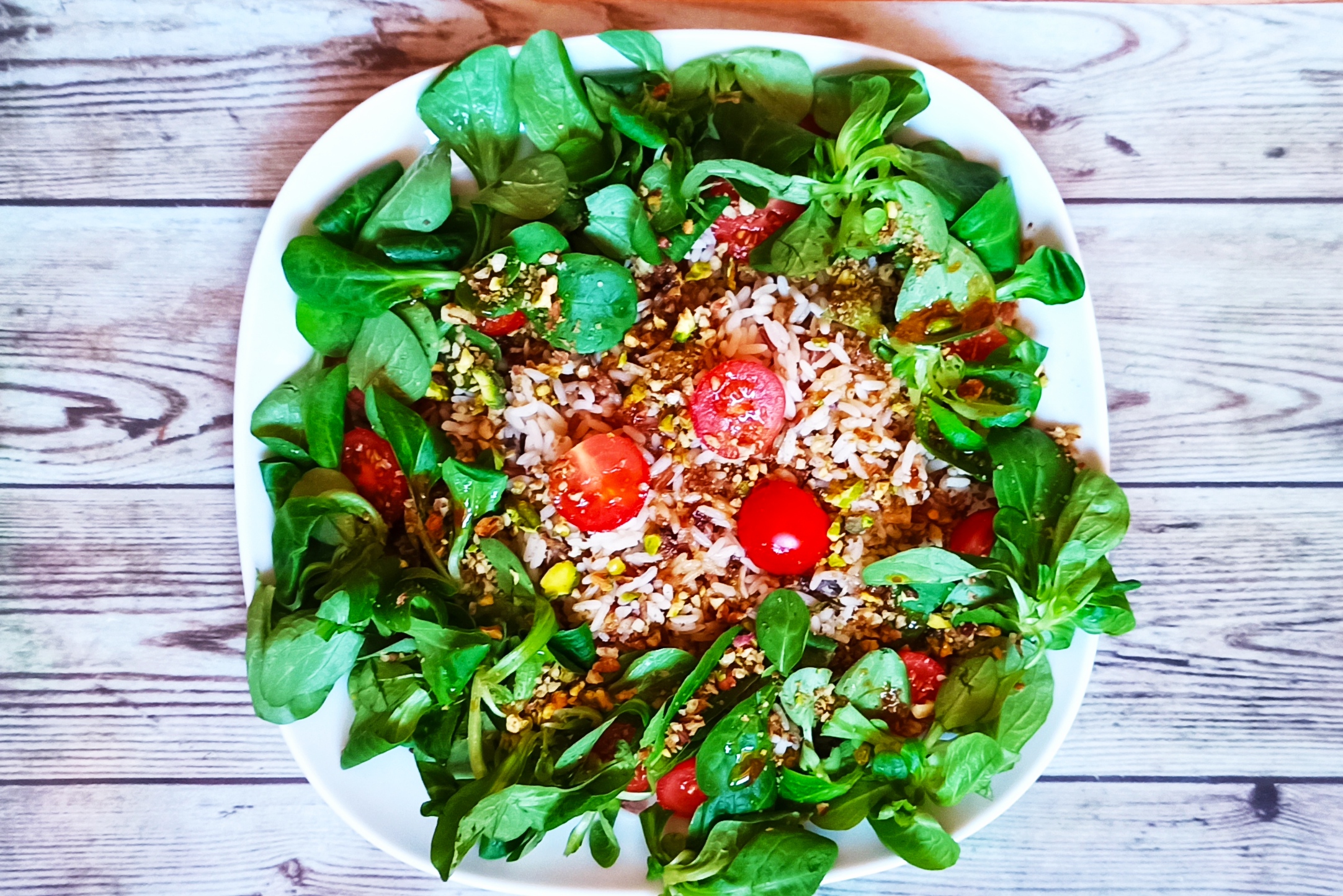 ?Ponemos en ensaladera el arroz los tomates y la rúcula. Añadimos las nueces picadas, las hojas de albahaca y el aderezo, mezclamos y servimos.