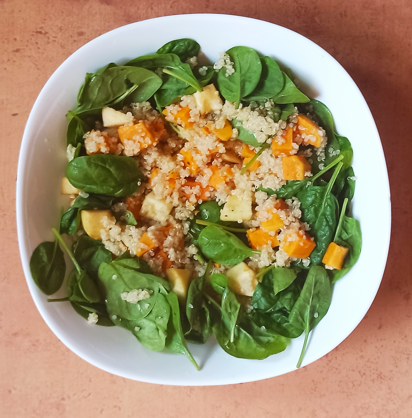 ENSALADA DE BATATA CON MANZANA, ESPINACAS Y QUINOA