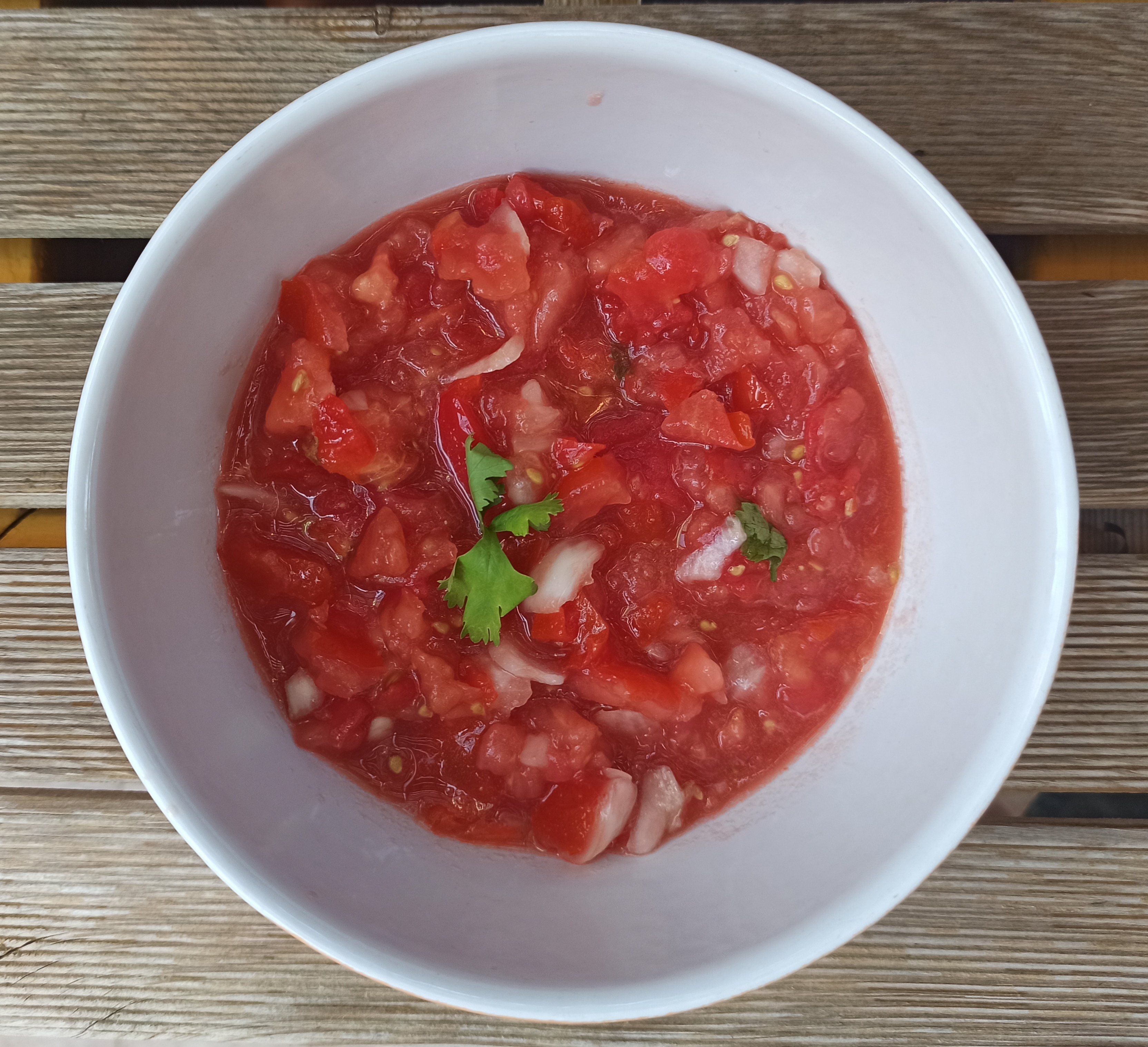 1. Colocamos el tomate, el chile serrano, el diente de ajo, la cebolla, la sal y el cilantro en el vaso, picamos 6 seg/vel 4.