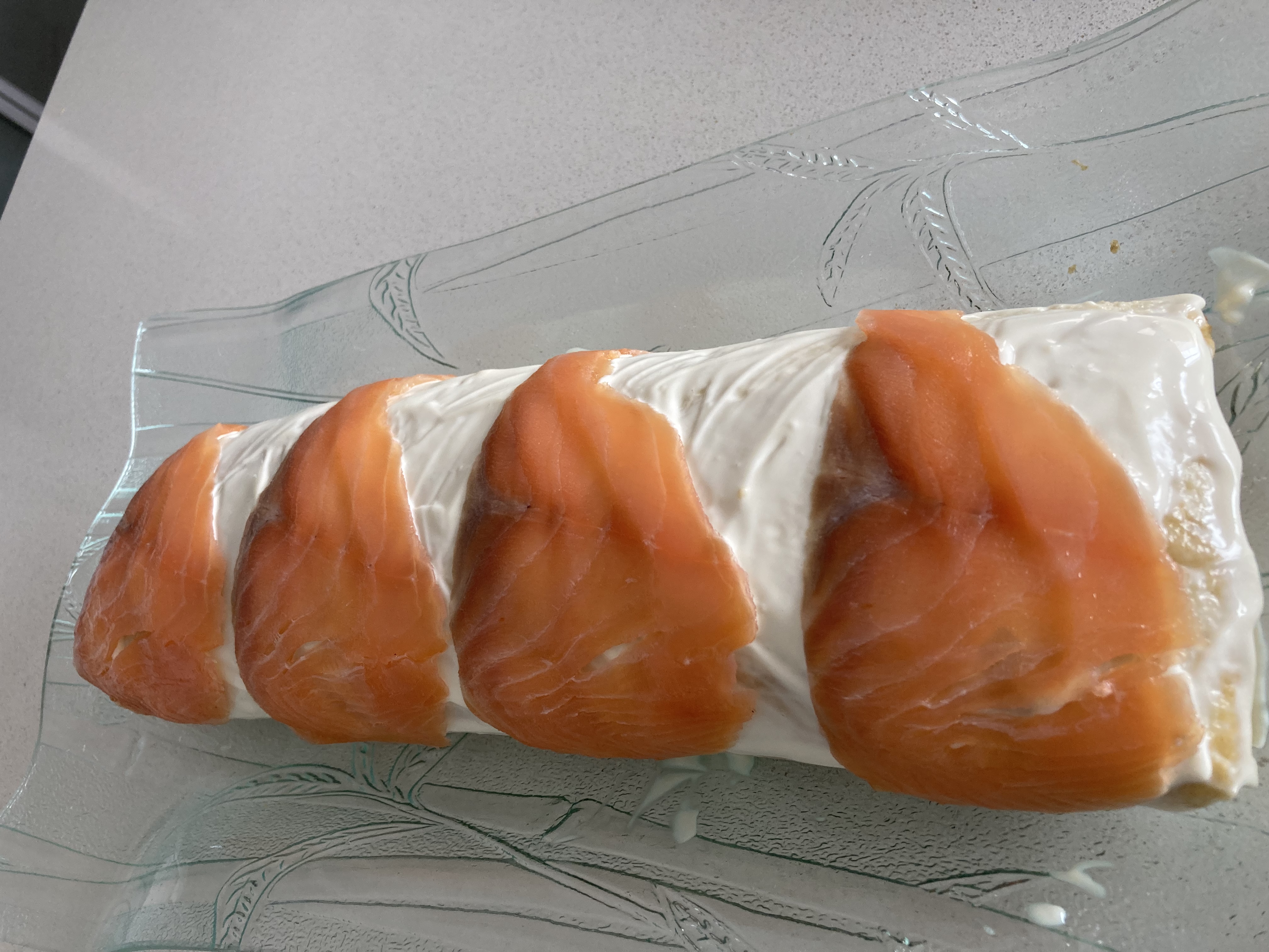 Cubra el brazo de gitano con una capa fina de mayonesa y coloque encima las lonchas de salmón. Corte en rodajas y sirva.