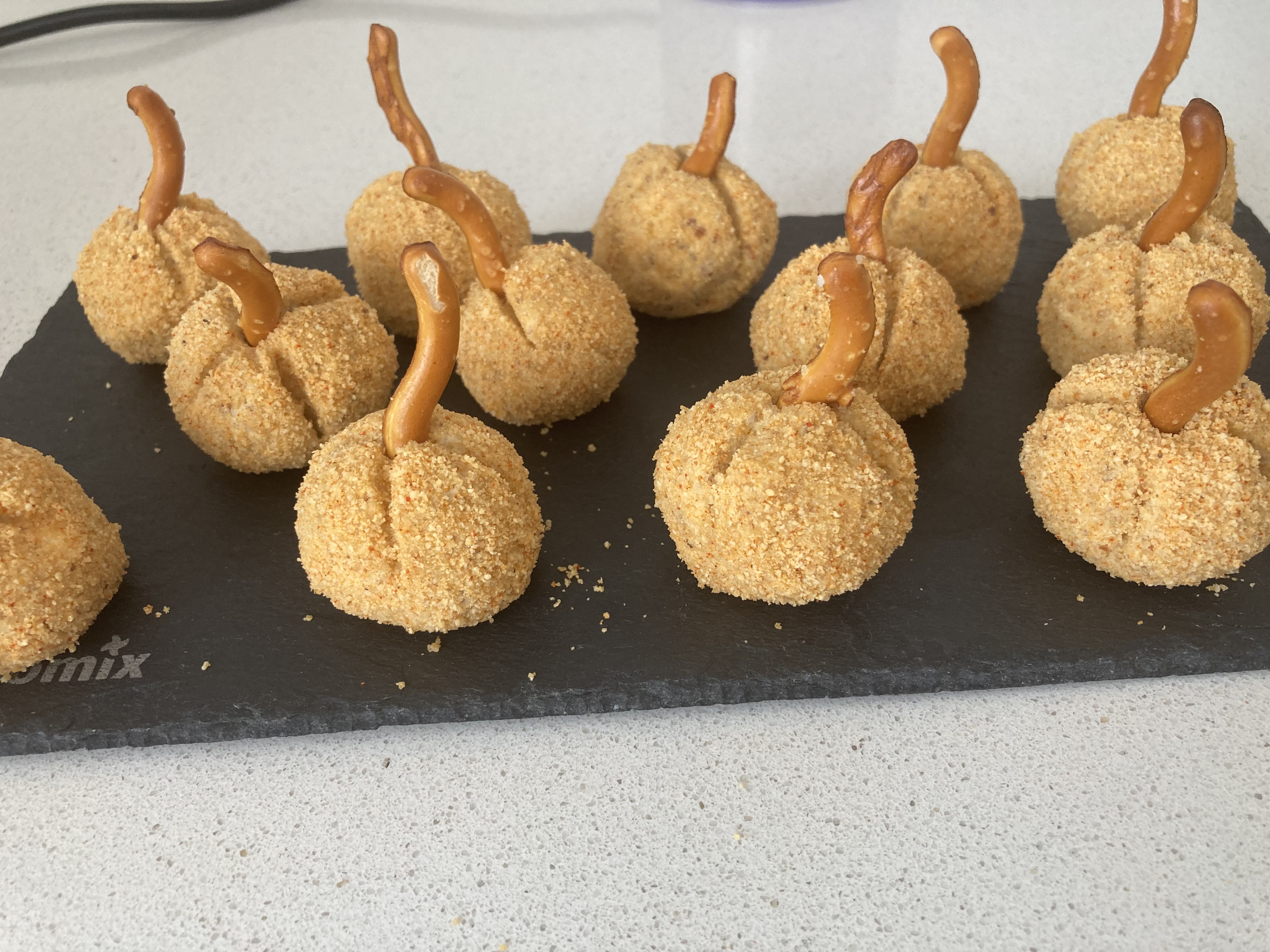 Con una cuchara, tome una porción de la crema de queso. Reboce con los nachos triturados y termine de darle forma de bola. Coloque las bolas en una bandeja hágales unas hendiduras presionando con un palillo imitando la calabaza y conserve en el frigorífico.