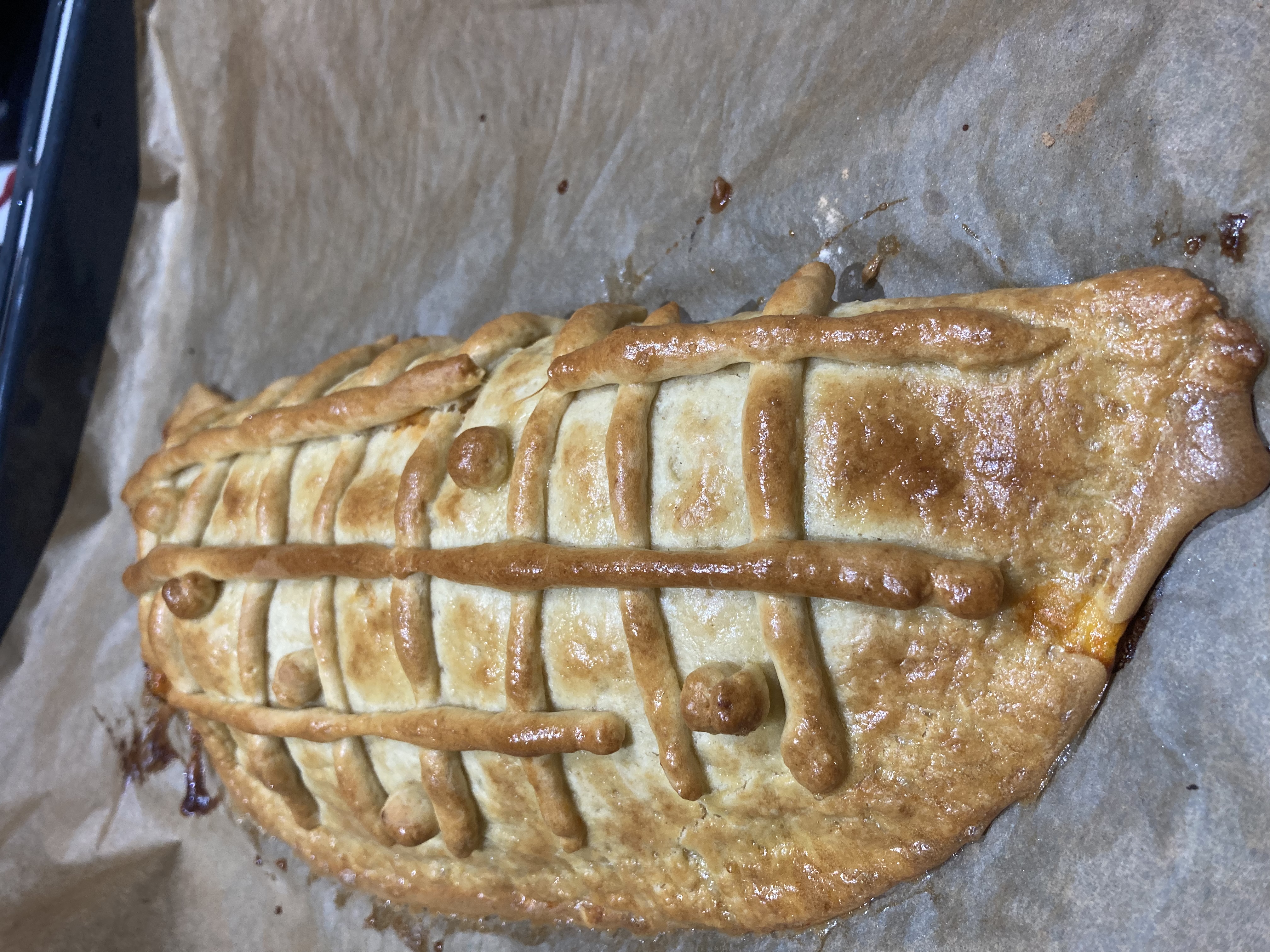 Ponga en el centro de la masa una o dos cucharadas del relleno y un trozo de huevo duro. Pinte con agua el borde, doble la masa por la mitad y selle el borde presionando con las púas de un tenedor (ver sugerencia). Repita el proceso hasta formar 20 empanadas. Colóquelas repartidas en las bandejas de horno preparadas y pincele la superficie con el huevo batido.
