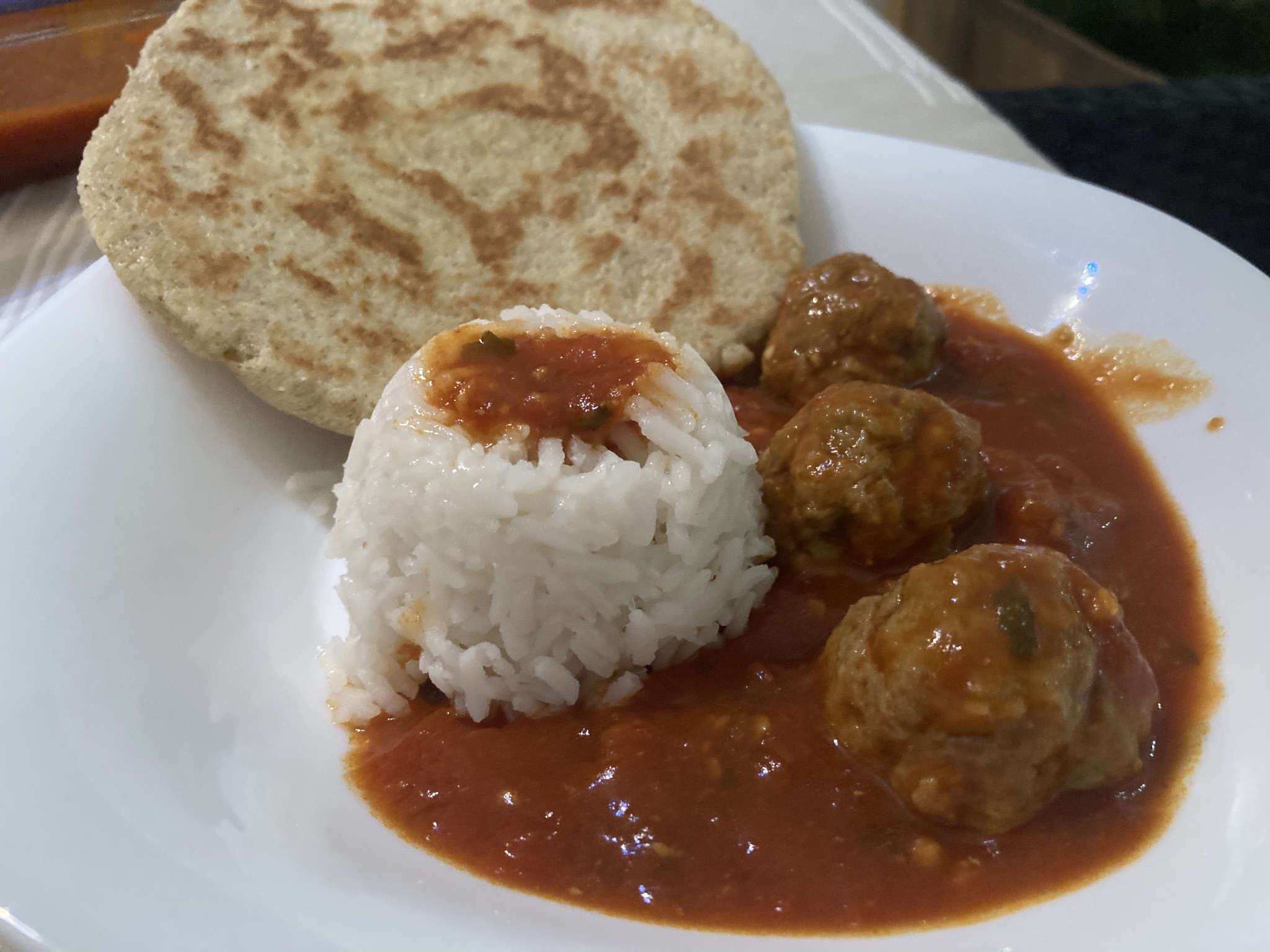 Retire el Varoma y mezcle las albóndigas en una fuente con la salsa del vaso. Sirva con los panes batbout.