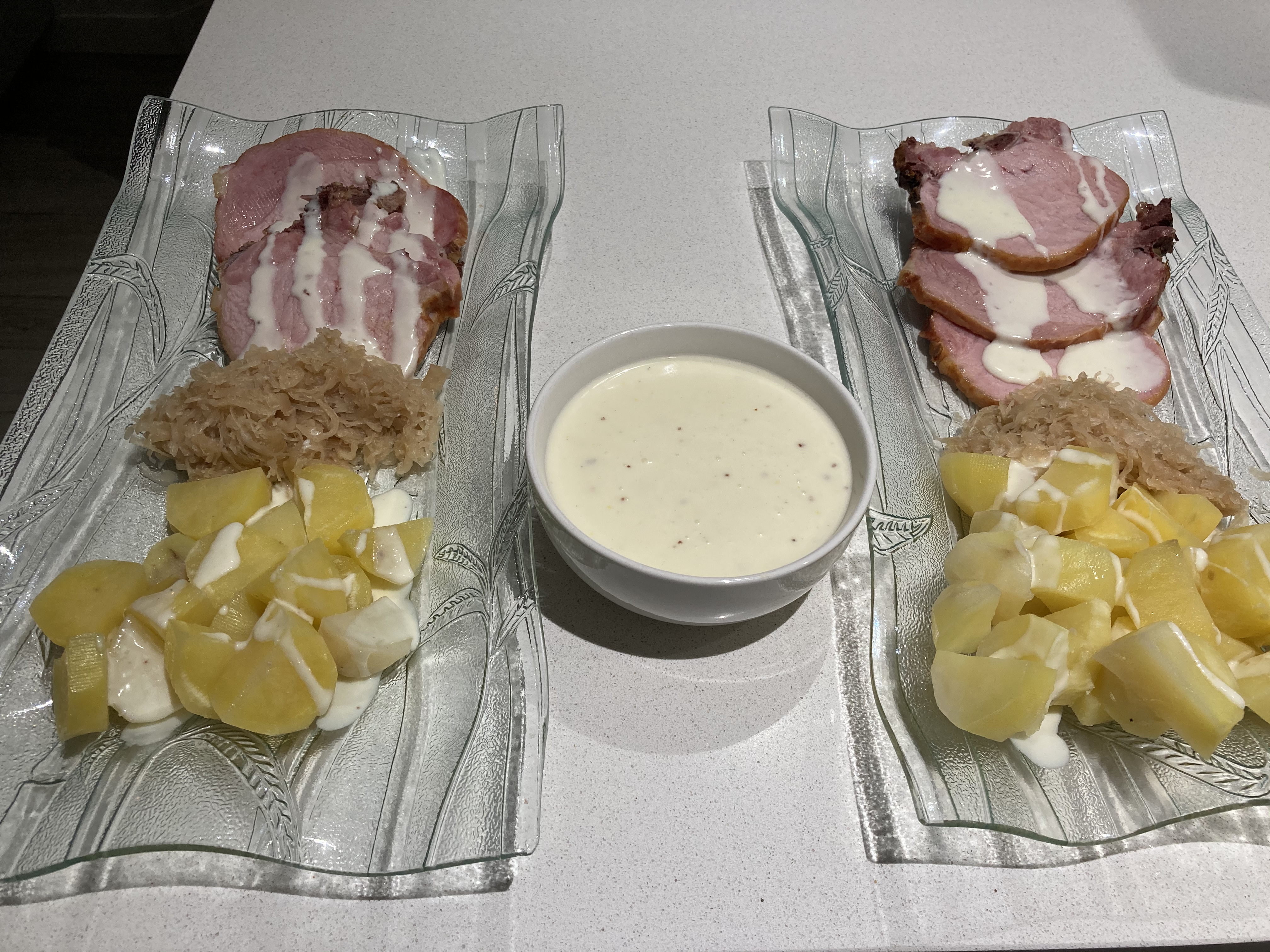 Ponga en el vaso 300 g agua, la maicena, la nata, la mostaza, la sal y la pimienta. Mezcle 15 seg/vel 5 y programe 6 min/100°C/vel 4. Retire el Varoma. Coloque el chucrut, las chuletas y las patatas en una fuente y sirva con la salsa.