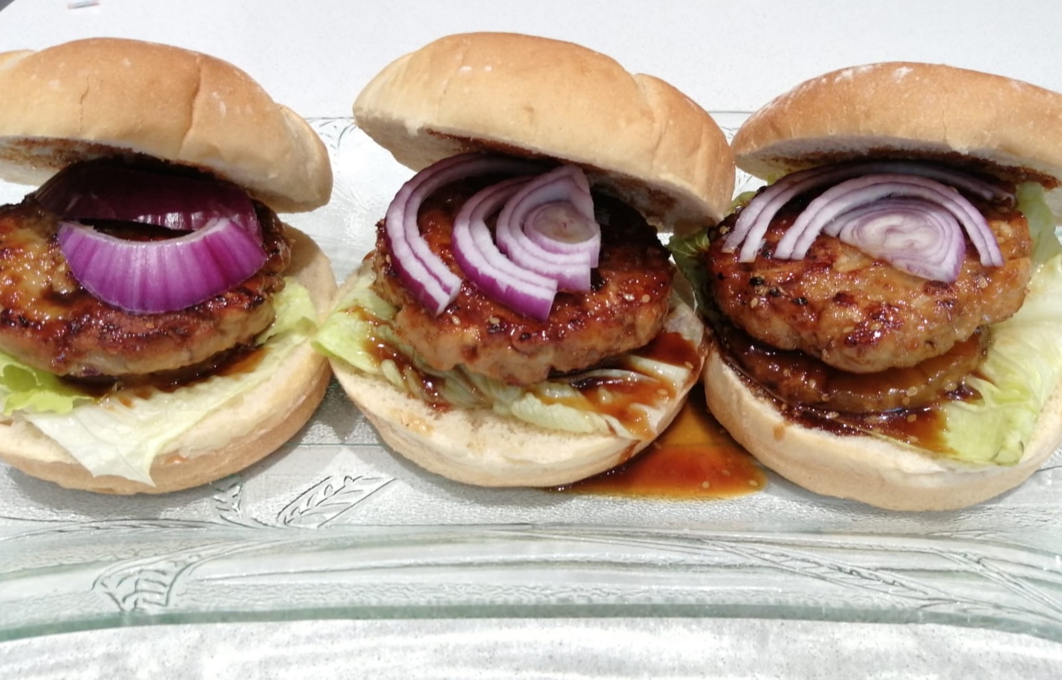 Unte bien las hamburguesas y las rodajas de piña con la salsa teriyaki y colóquelas en el pan de hamburguesa. Sirva inmediatamente, con lechuga y rodajas de cebolla roja.