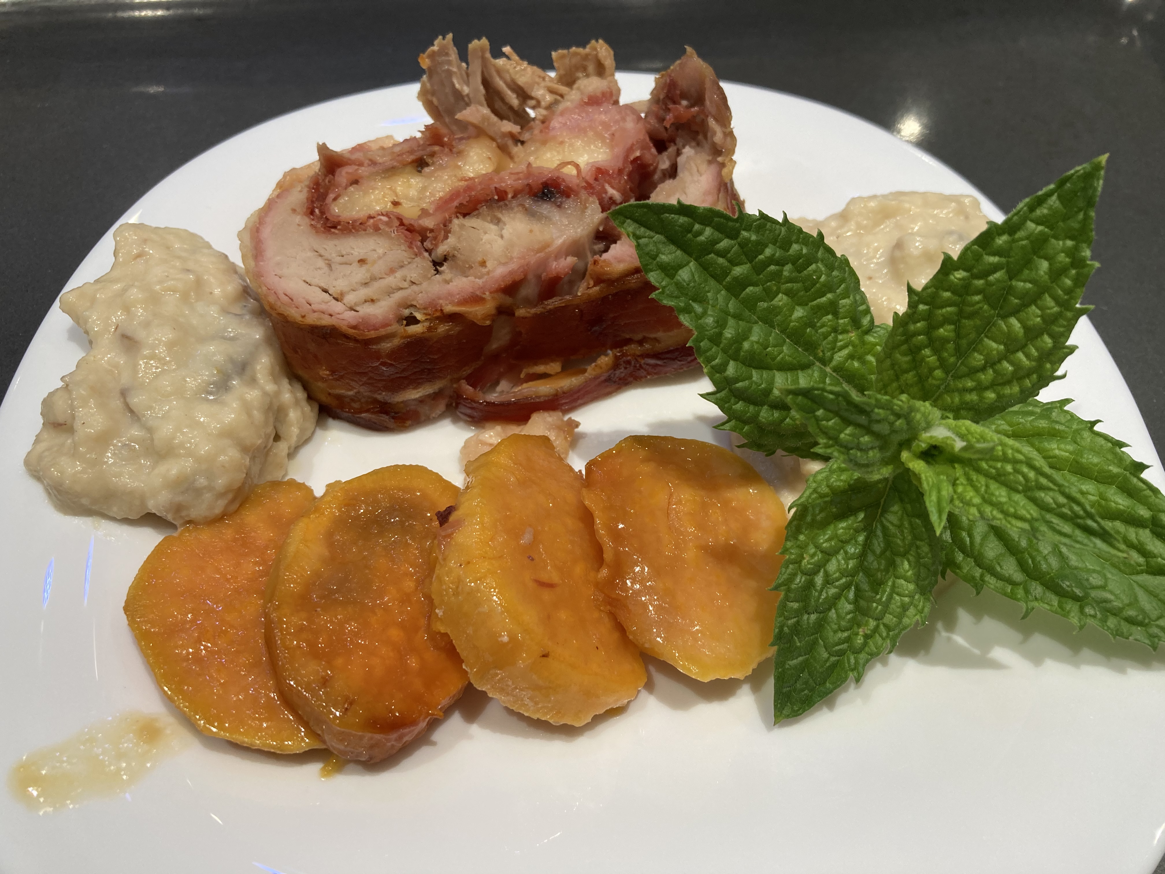 Coloque uno de los solomillos abiertos sobre la superficie de trabajo y ponga encima las lonchas de jamón ibérico, de jamón cocido y de queso. Coloque una fila de ciruelas pasas en el extremo más cercano a usted y comience a enrollar apretando muy bien como si fuera un brazo de gitano. Antes de llegar al final, coloque las lonchas de beicon sobre el extremo a modo de extensión de la carne y siga enrollando hasta que quede toda la carne envuelta en beicon. Envuelva el rollo con film transparente y hágalo rodar sobre la superficie de trabajo, sujetando los extremos para que quede bien sellado. Repita el procedimiento con el otro solomillo. Pinche los rollos con un tenedor y colóquelos dentro del recipiente Varoma. Coloque las rodajas de batata alrededor de la carne, tape el Varoma y reserve.