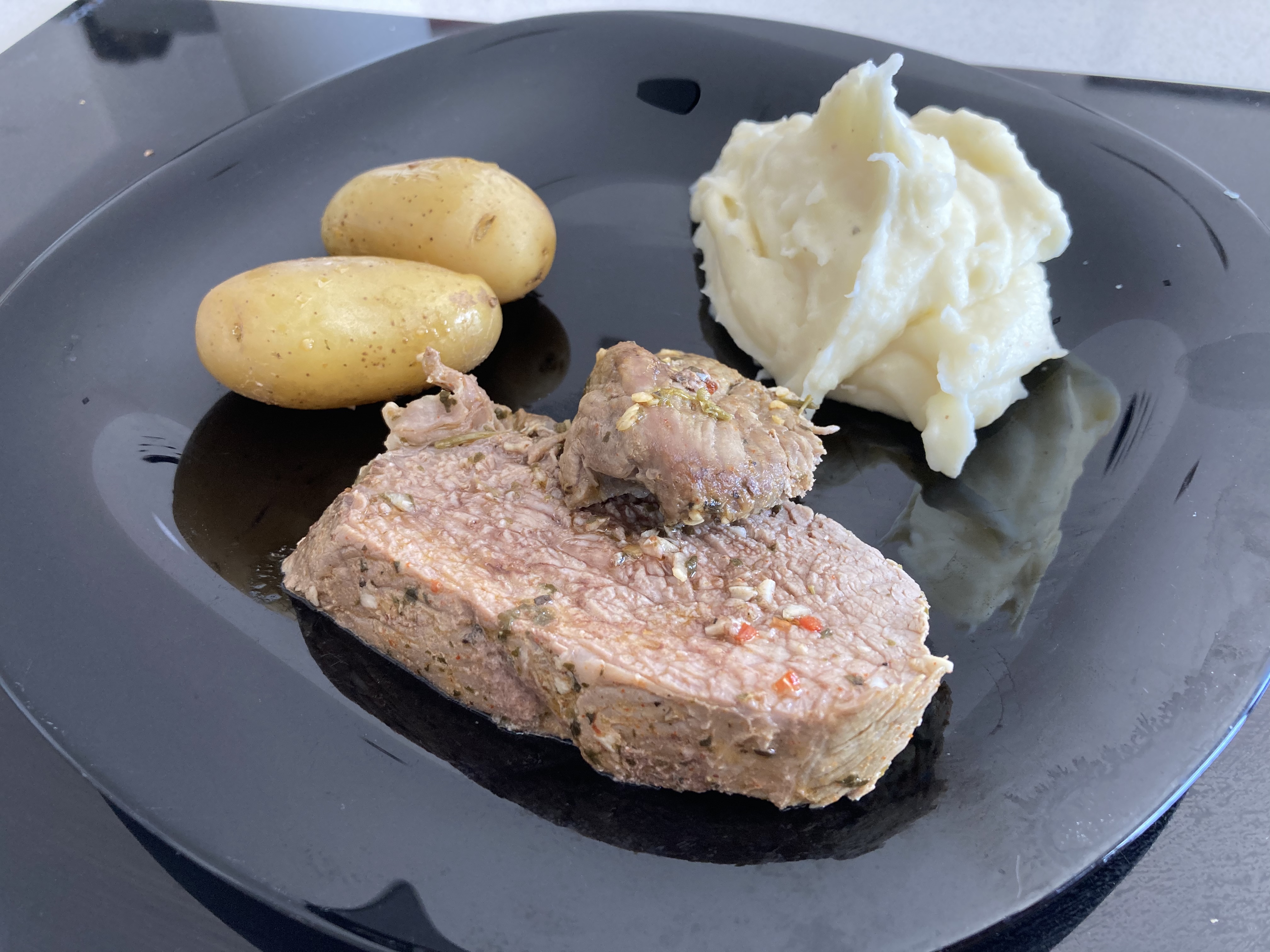 Retire el Varoma. Saque el rabillo de la bolsa (reserve el líquido) y córtelo en lonchas. Colóquelas en una fuente refractaria y vierta encima el líquido de la bolsa. Introduzca la bandeja en el horno para mantener la carne caliente mientras prepara el puré de patatas.