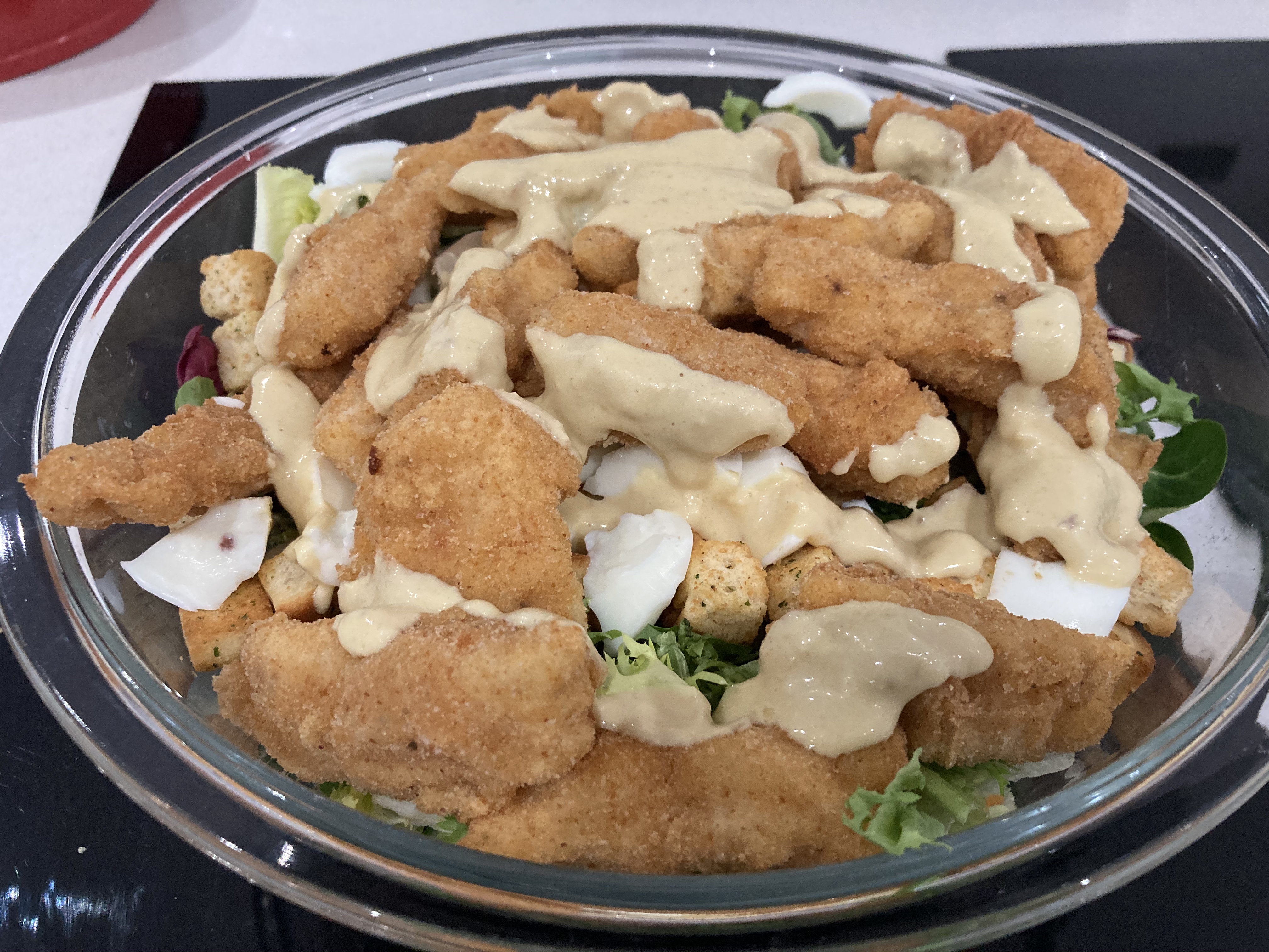 En un bol grande, ponga los brotes de lechuga variada y distribuya los picatostes, las lascas de parmesano, los fingers de pescado reservados y las claras de huevo troceadas. Riegue con la salsa del vaso y sirva.