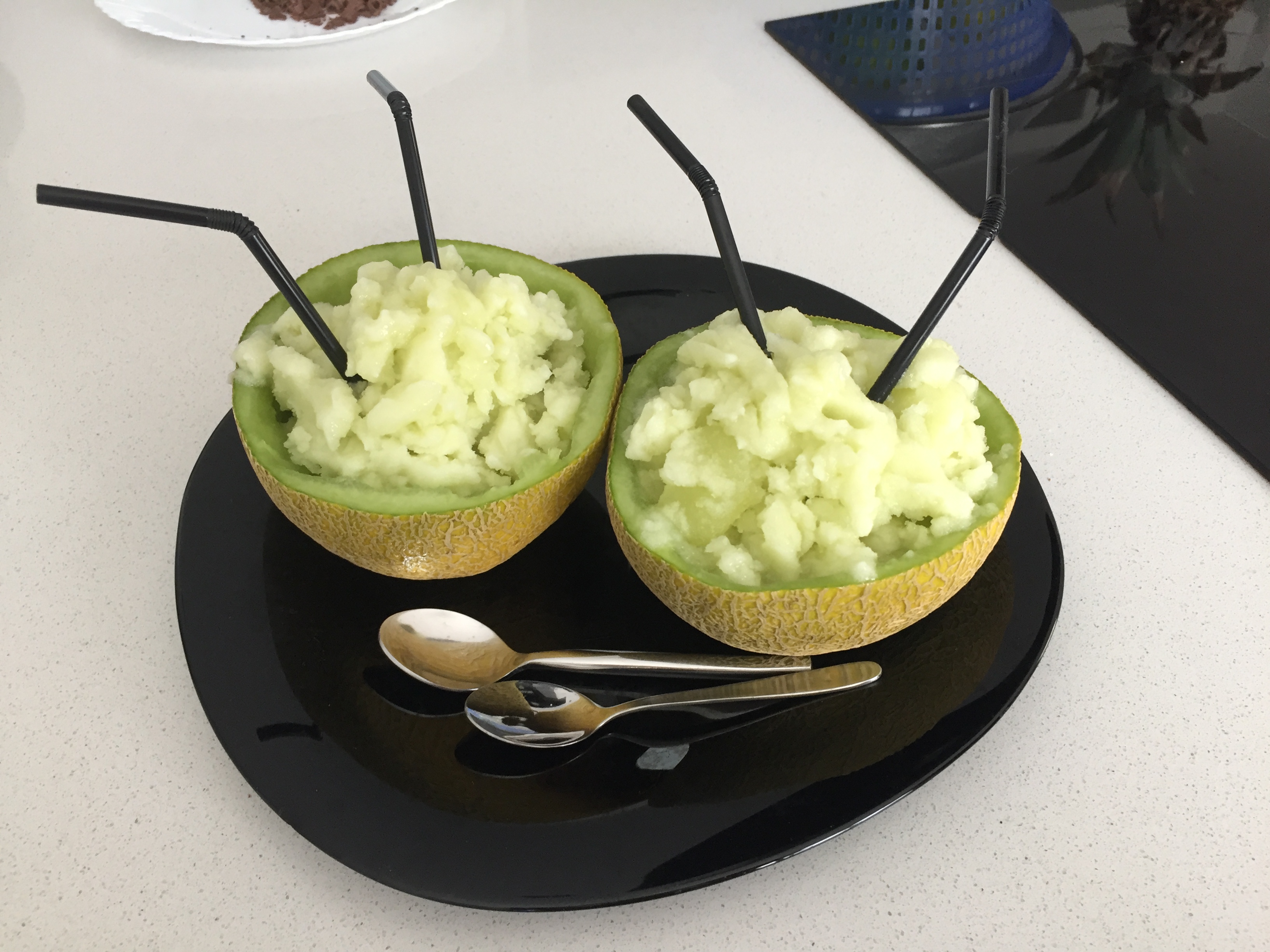 Justo antes de servir, ponga en el vaso los cubitos de pulpa de melón congelada y triture 3 seg/vel 6.