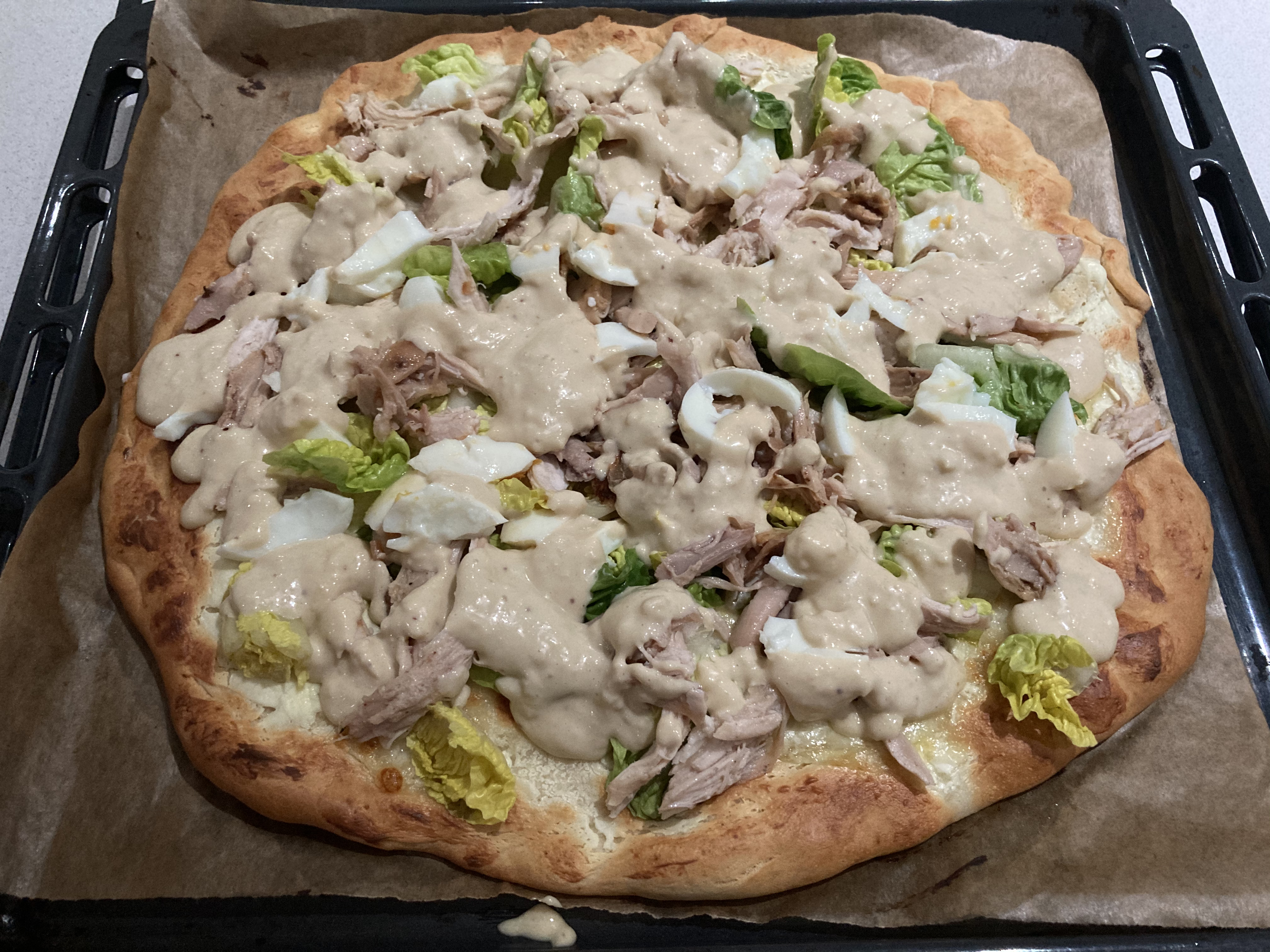 Retire la pizza del horno y distribuya sobre la superficie los cogollos troceados con la mano, el pollo desmenuzado y las claras de huevo troceadas. Riegue con la salsa césar, corte en porciones y sirva.