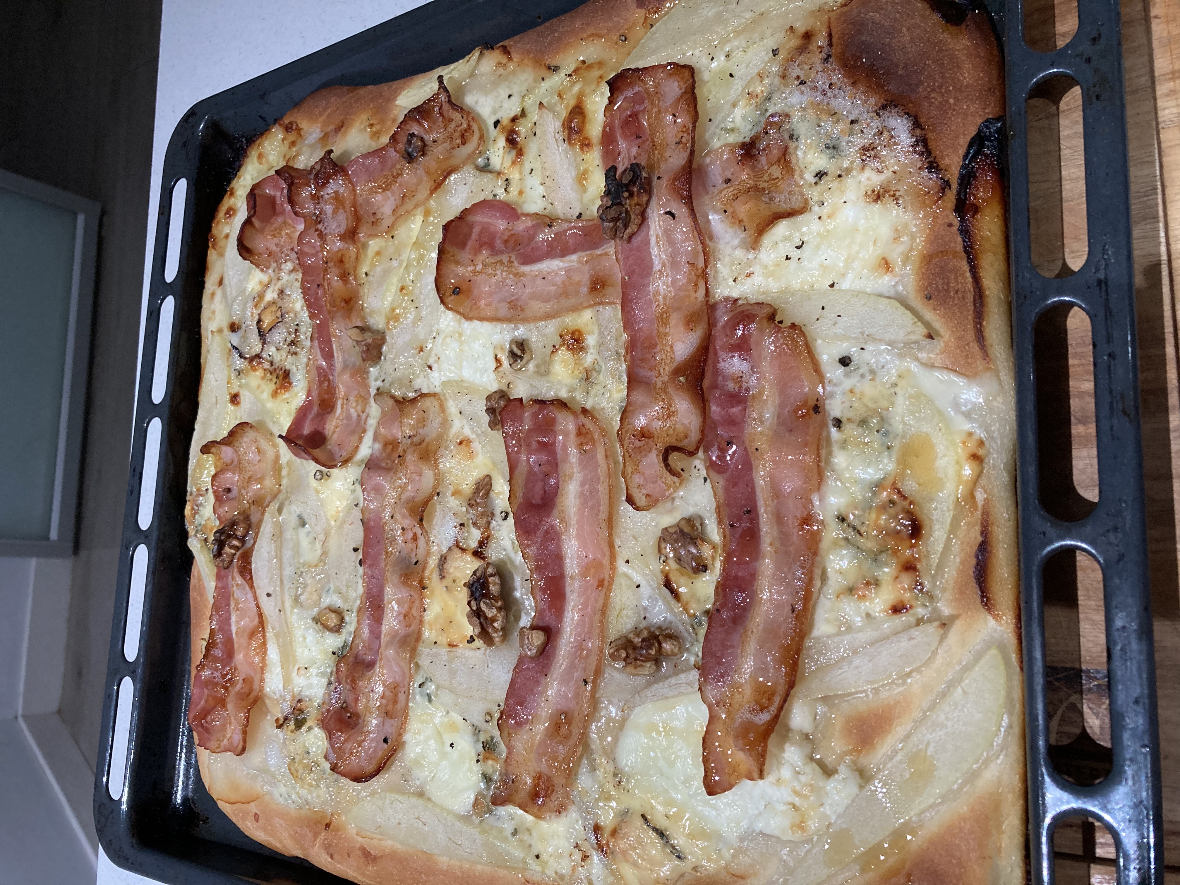 PIZZA CON QUESO AZUL,BEICON,PERA Y MIEL