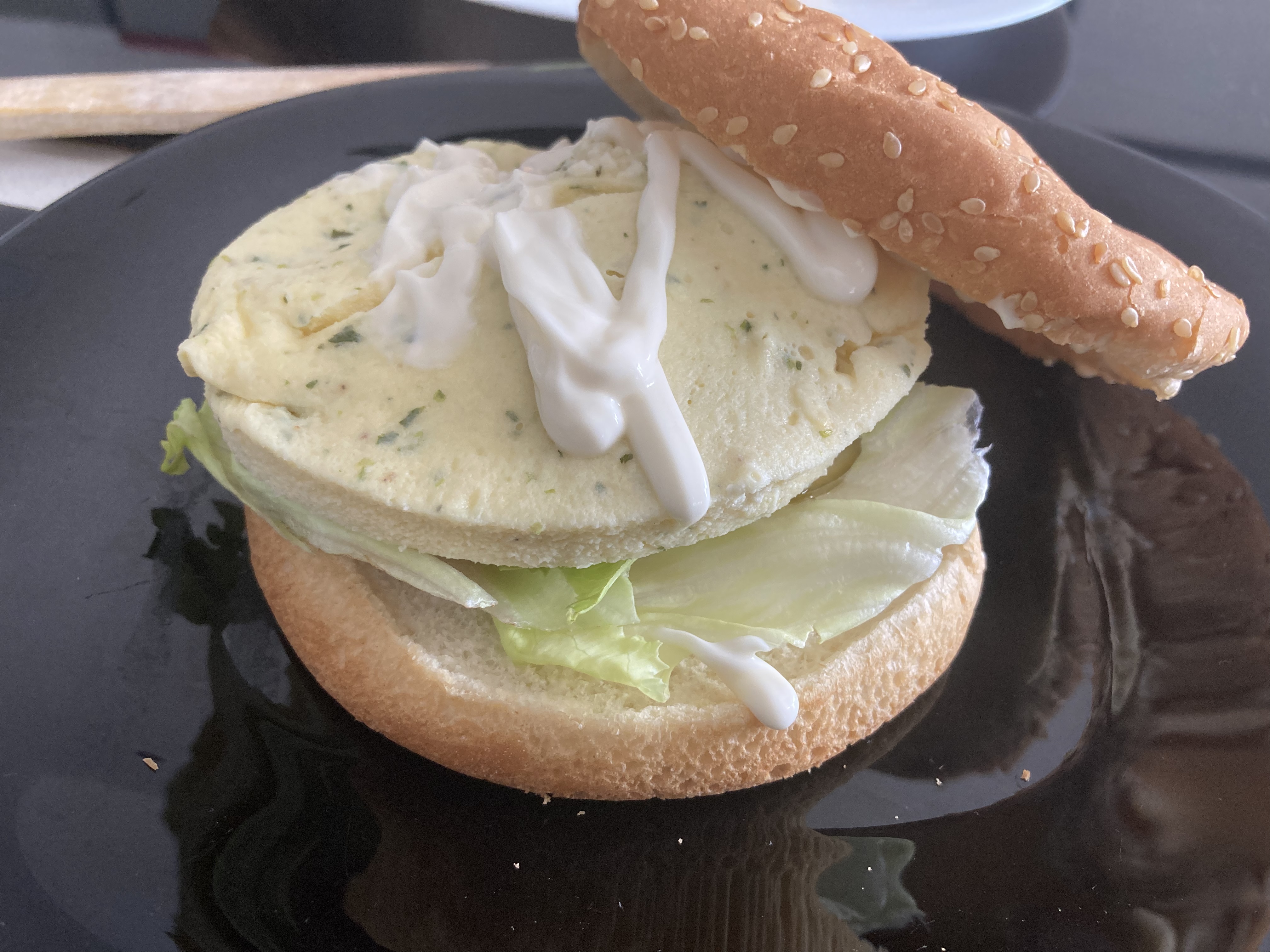 Corte 4 panes de hamburguesa por la mitad. En cada mitad inferior del pan, coloque hojas de lechuga, un trozo de tortilla, 2-3 rodajas de tomate, 2-3 rodajas de cebolla roja, 2-3 rodajas de pepinillos, 1-2 hojas de perejil. Sazone con sal, riegue con un chorrito de aceite y cubra con la mitad superior del pan y sirva (ver sugerencia).