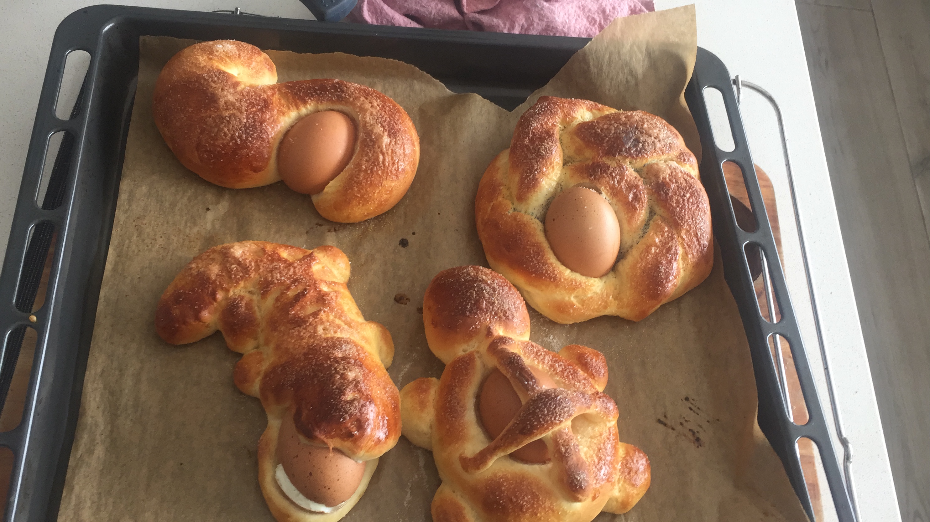 Con la masa forme una bola y luego divídala en 10 porciones. Haga con ellas diferentes formas (redondas, alargadas, con forma de animales, etc.). Colóquelas en la bandeja de horno preparada. Ponga encima de cada una 1 huevo duro teñido, píntelas con huevo batido y espolvoree con azúcar. Deje reposar hasta que doblen su volumen.